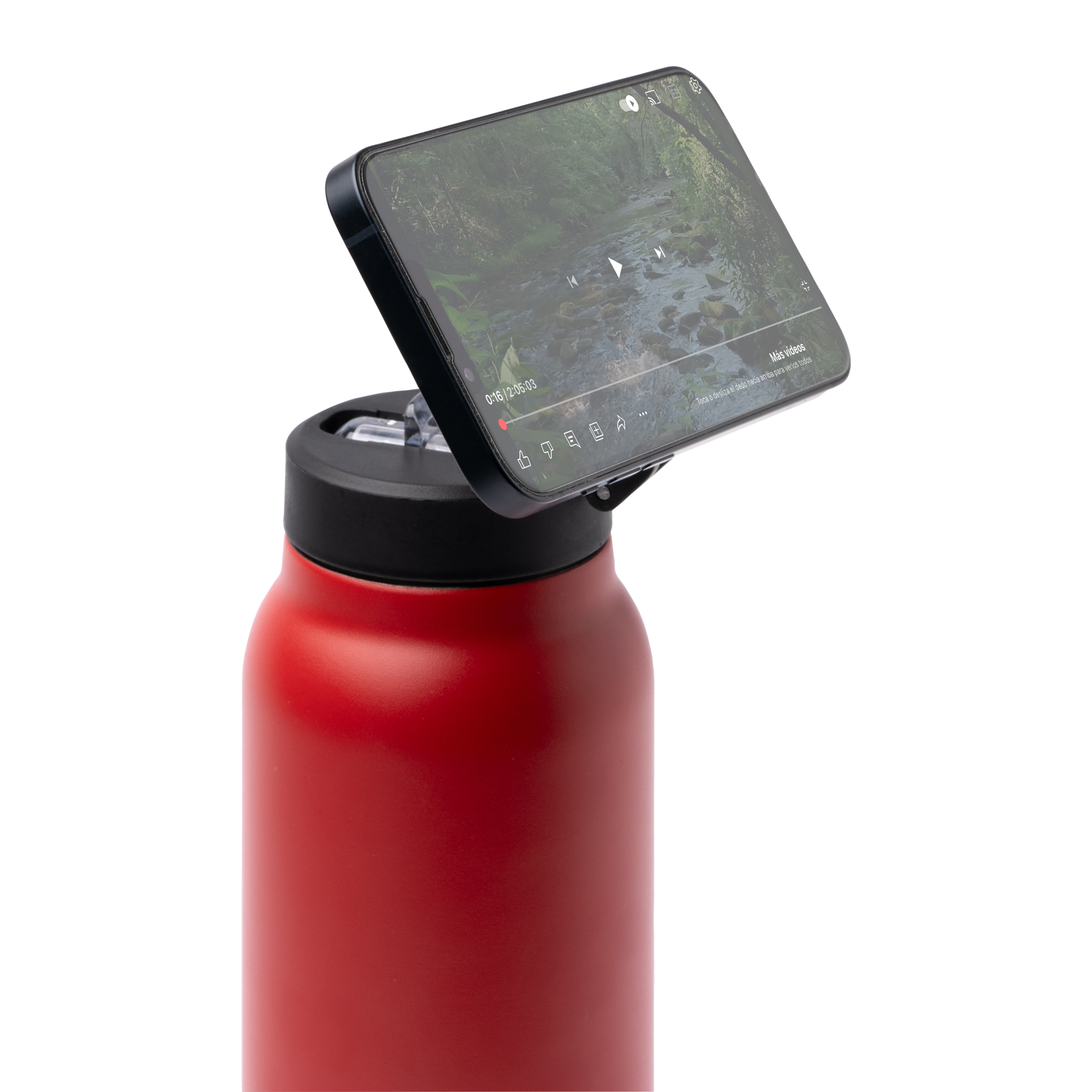 Bidón térmico de acero inoxidable 304 reciclado de doble pared. Tapa con aro magnético para soporte de móvil. Con pajita plegable y goma antideslizante en la base. Capacidad 750 ml.