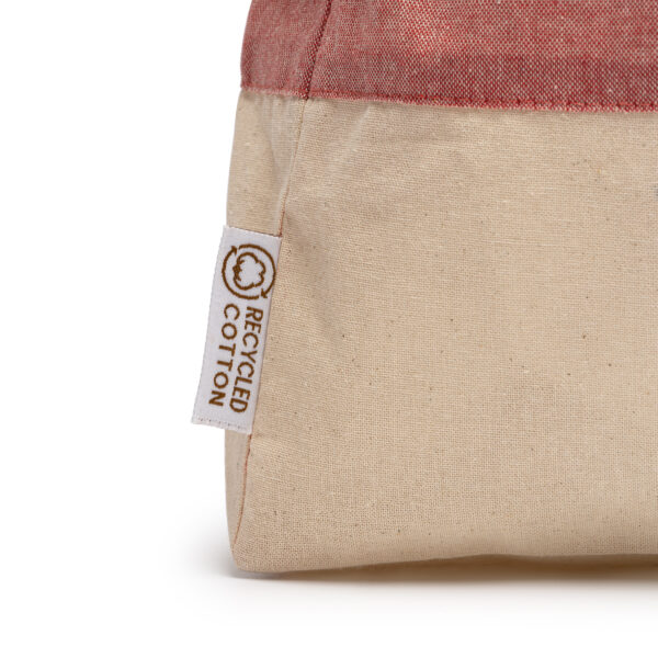 Bolsa bicolor de algodón reciclado con acabado jaspeado en el cuerpo y algodón natural de 120 g/m² en la parte inferior. Incorpora fuelle, haciéndola más adaptable al transporte de diferentes enseres. Cuenta con asas largas reforzadas de 70 cm para hacerla más cómoda y resistente.