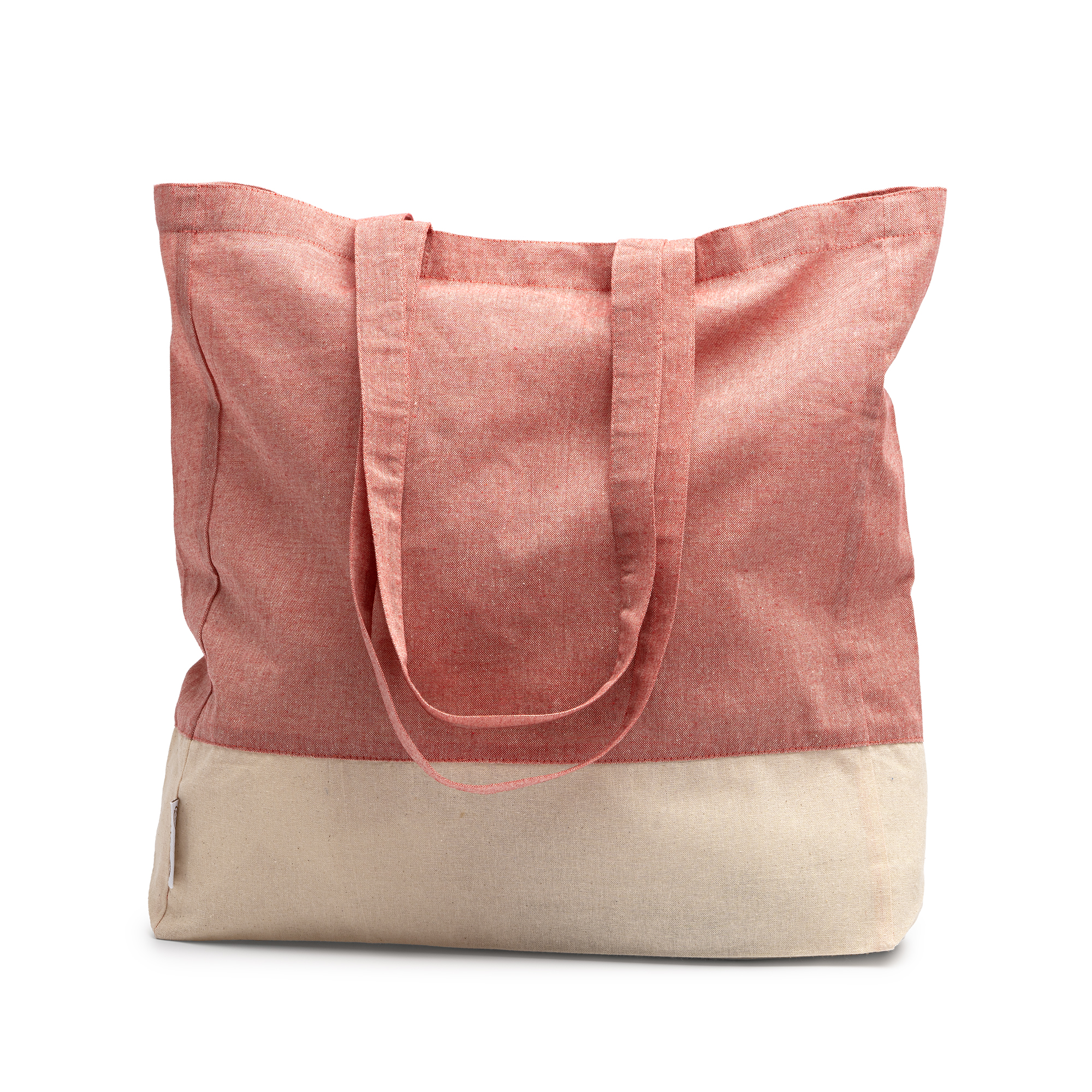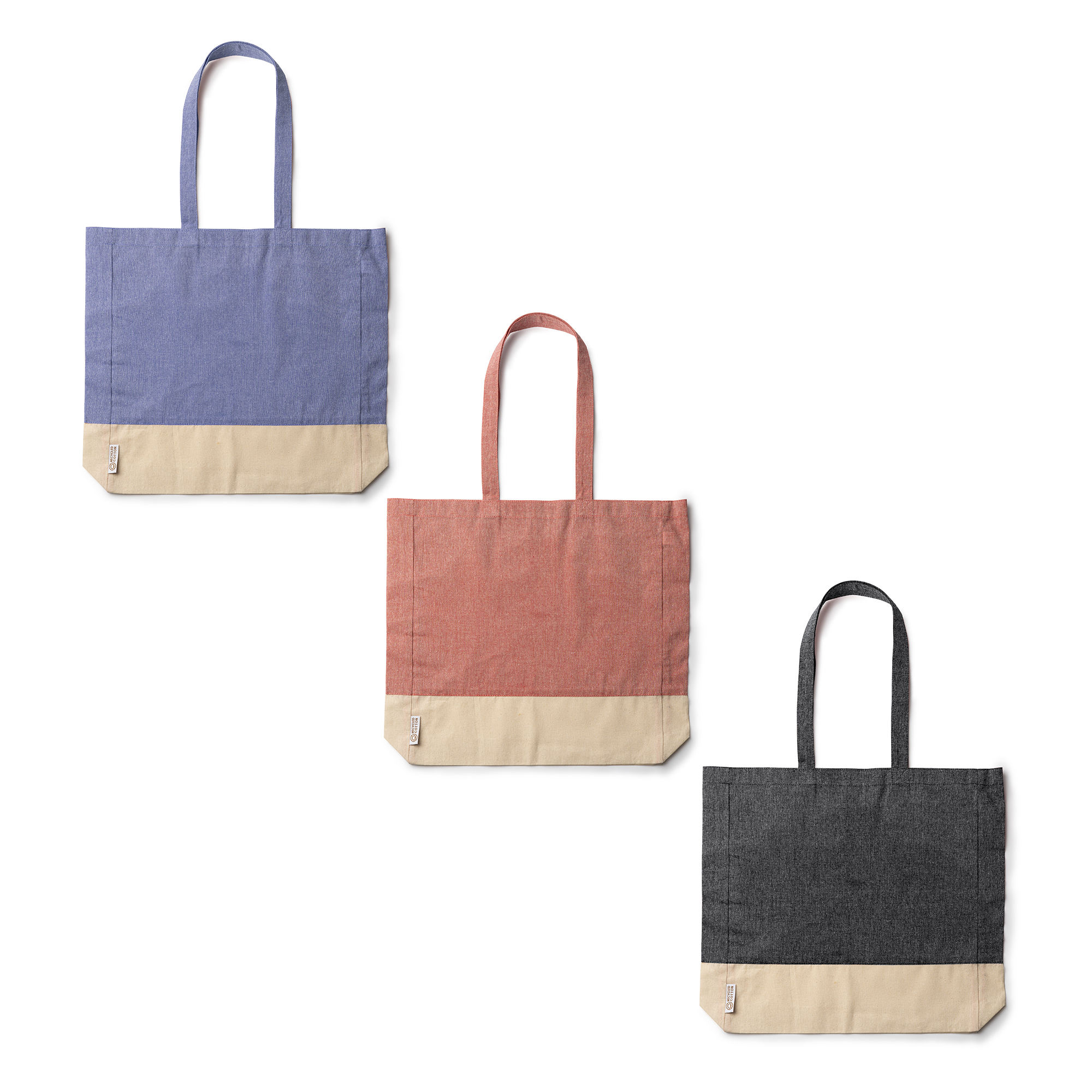 Bolsa bicolor de algodón reciclado con acabado jaspeado en el cuerpo y algodón natural de 120 g/m² en la parte inferior. Incorpora fuelle, haciéndola más adaptable al transporte de diferentes enseres. Cuenta con asas largas reforzadas de 70 cm para hacerla más cómoda y resistente.