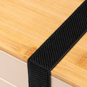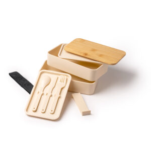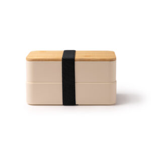 Fiambrera de PP con dos compartimentos apta para alimentos con tapa de bambú. Incluye set de cubiertos integrado en una de las tapas, una pieza separadora extraíble para poder separar diferentes alimentos dentro del mismo compartimento y cinta de seguridad para un cierre más hermético. Capacidad de 800ml.