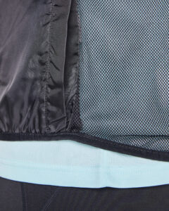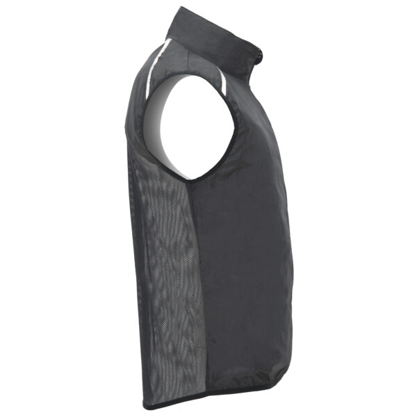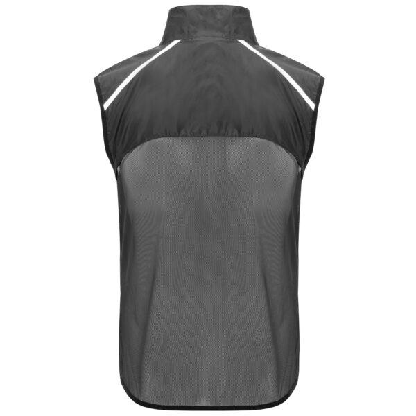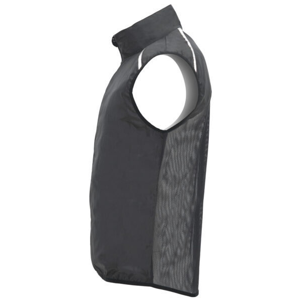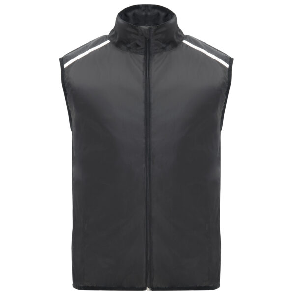 Chaleco cortavientos ultraligero. Cremallera frontal al tono. Protector de barbilla. Espalda en tejido de malla transpirable. Bandas reflectantes en el frontal y en espalda de los hombros como puntos de visibilidad aumentada. Sisas y bajo con ribete elástico al tono. Bolsillo lateral izquierdo para plegado.