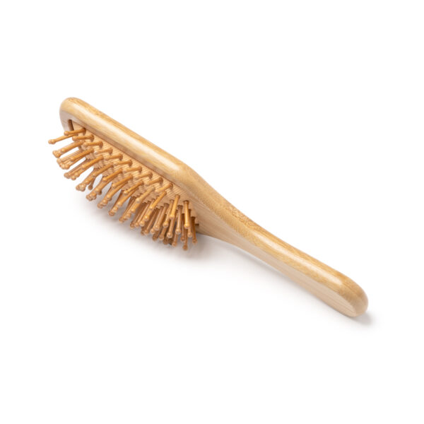 Cepillo para el pelo con cuerpo y cerdas elaboradas en bambú, ideal para un cuidado suave y natural del cabello, promoviendo la sostenibilidad ambiental.Composición: BambúObservaciones: Presentación en caja de diseño eco.