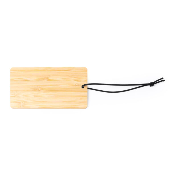 Identificador de maletas de bambú con diferentes campos de información. Cuenta con banda elástica en color negro y nudo en su extremo para hacer más fácil su uso, dotándola con ello de versatilidad en diferentes tipos de sujeciones.