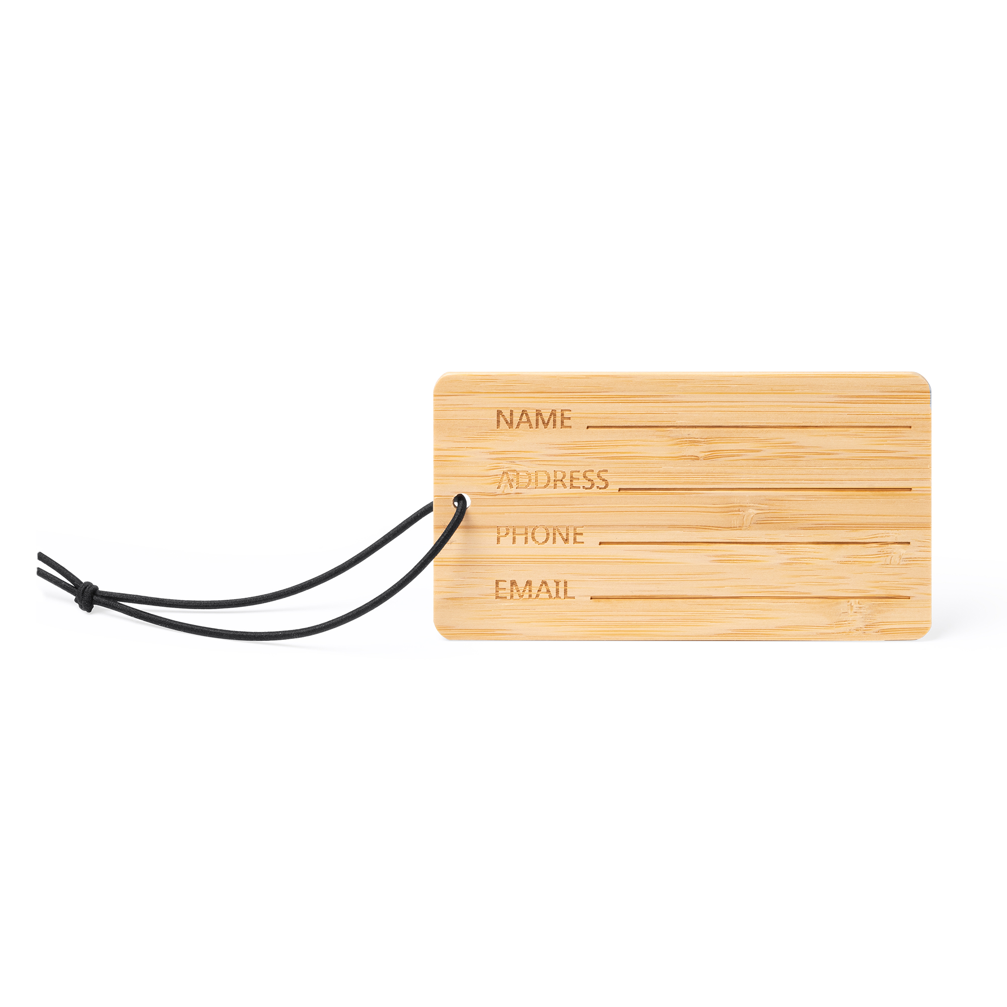 Identificador de maletas de bambú con diferentes campos de información. Cuenta con banda elástica en color negro y nudo en su extremo para hacer más fácil su uso, dotándola con ello de versatilidad en diferentes tipos de sujeciones.