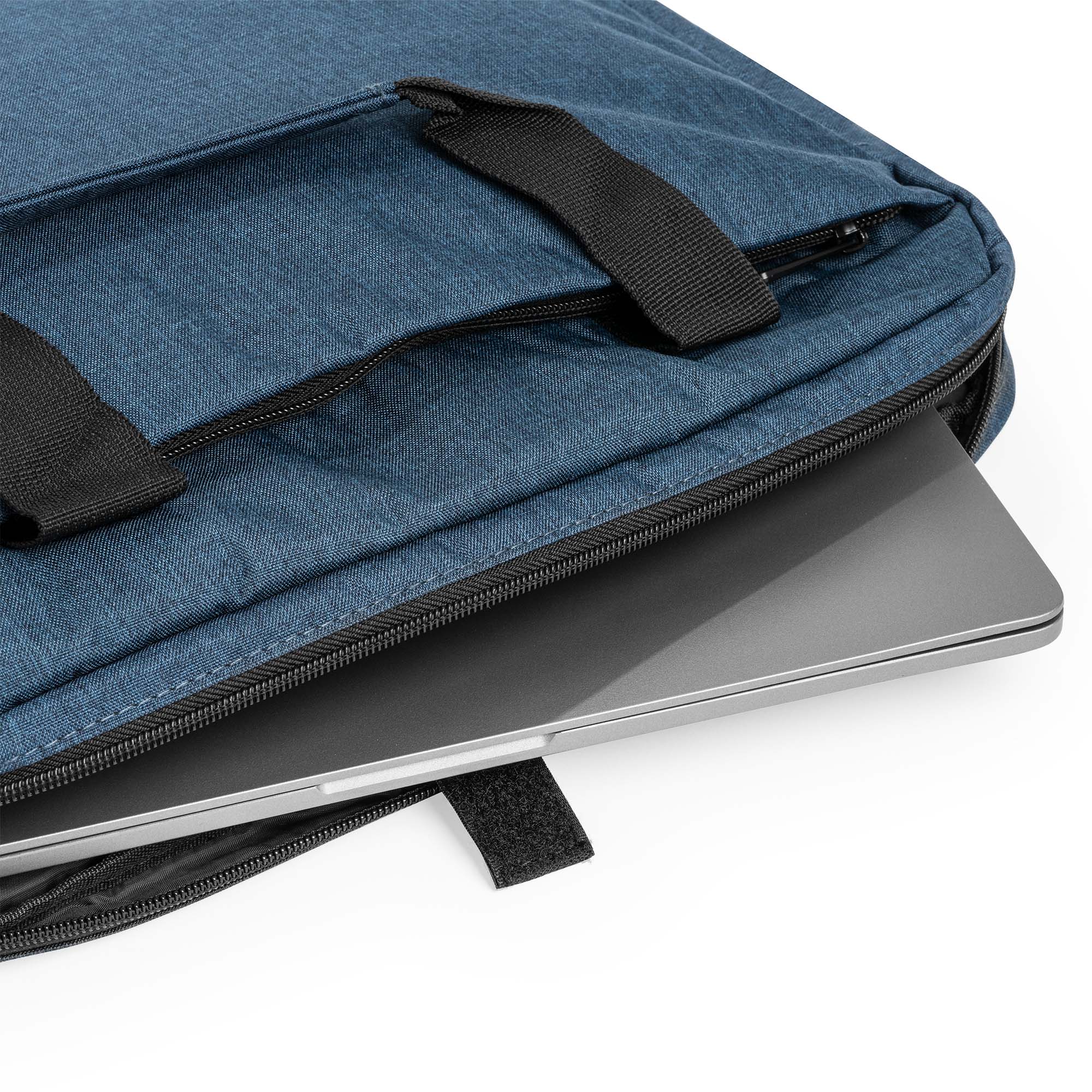 Portadocumentos acolchado para portátil realizado en poliéster reciclado RPET 600D con diseño vigoré. Cuenta con dos compartimentos con cremallera impermeable, asas de transporte y cinta bandolera ajustable a juego. Incluye cinta para trolley.