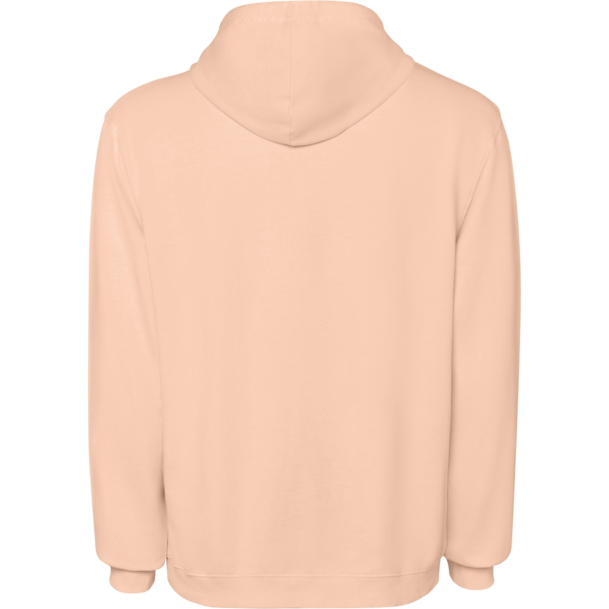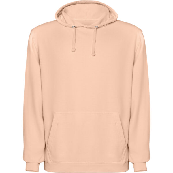 Sudadera unisex de algodón efecto lavado no perchado, con capucha. Bolsillo canguro. Puños y cinturilla en canalé 2×1 con elastano. Cordón plano al tono con ojales metálicos. Cubrecosturas del mismo tejido.