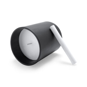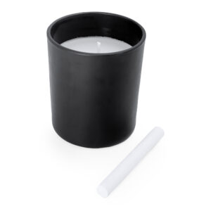Vela aromática con olor a vainilla en recipiente cerámico negro redondo. Incluye una tiza para escribir sobre el recipiente. Vela y mecha blancas. Fragancia de vainilla.