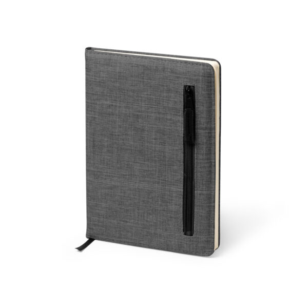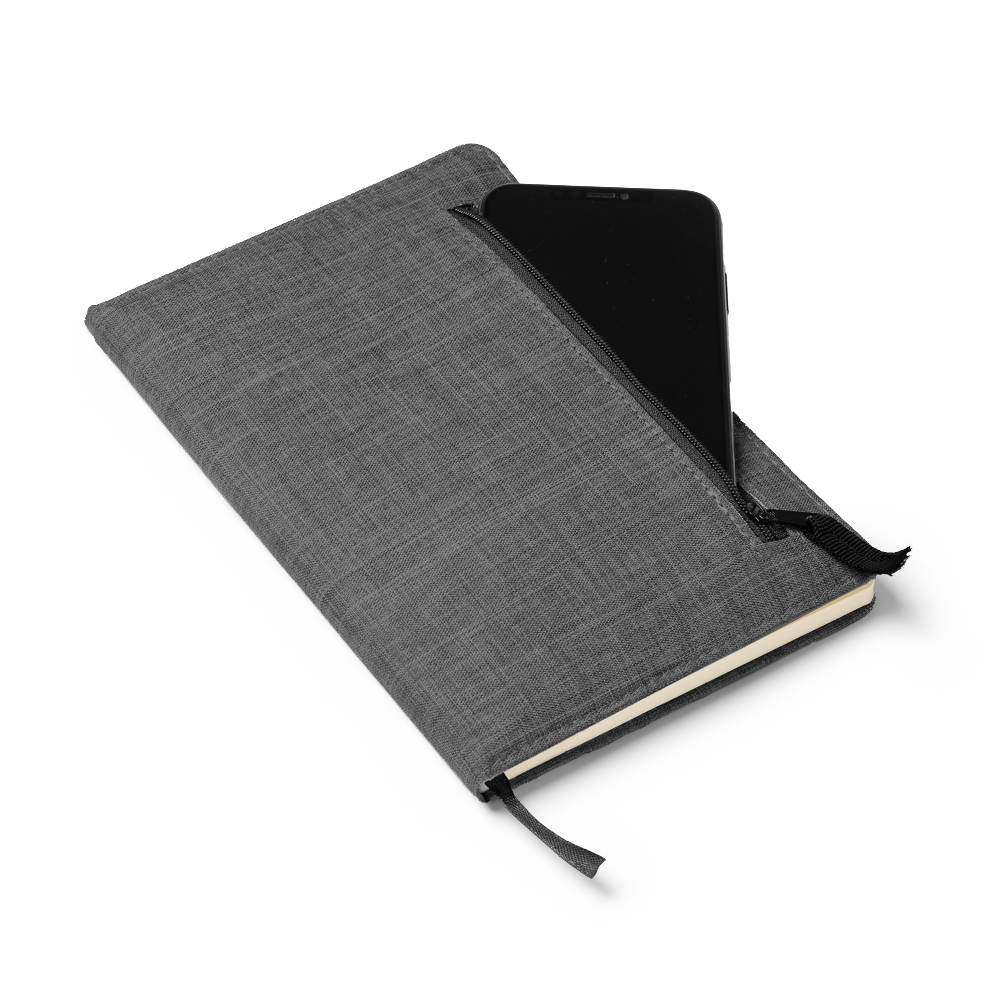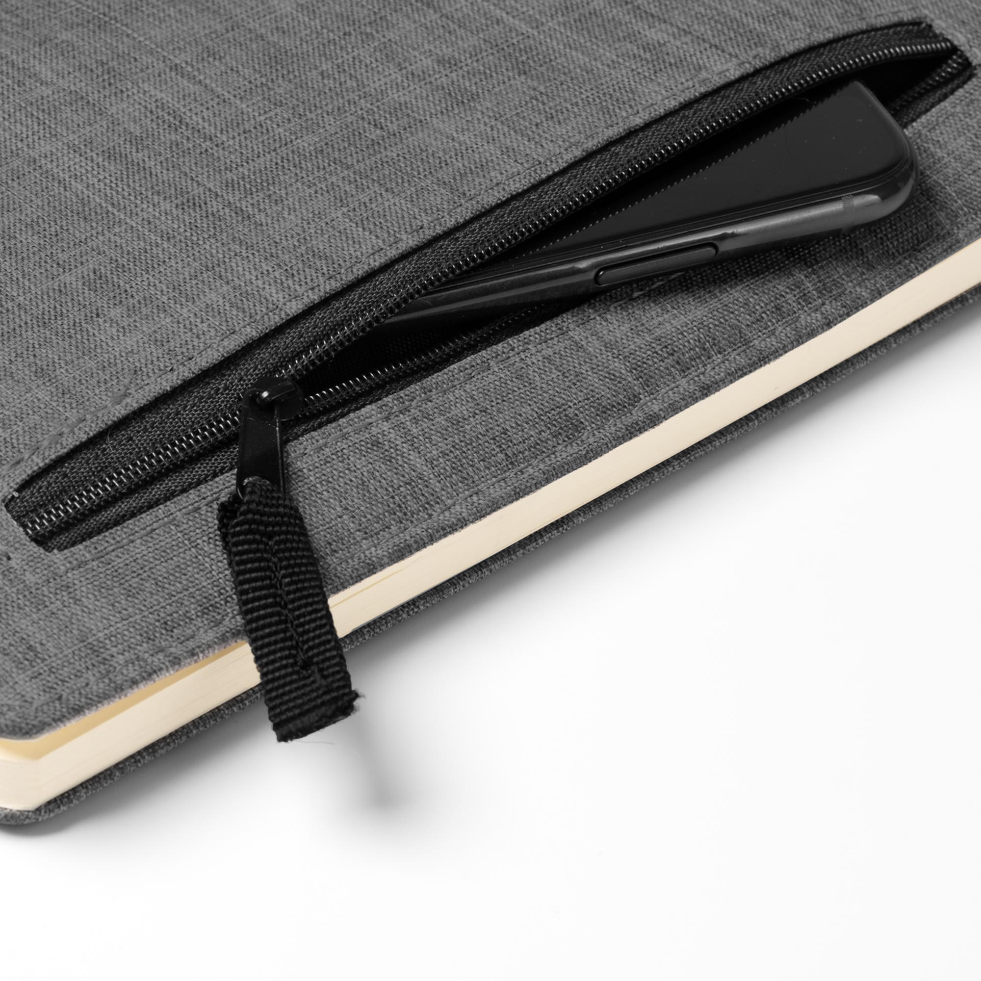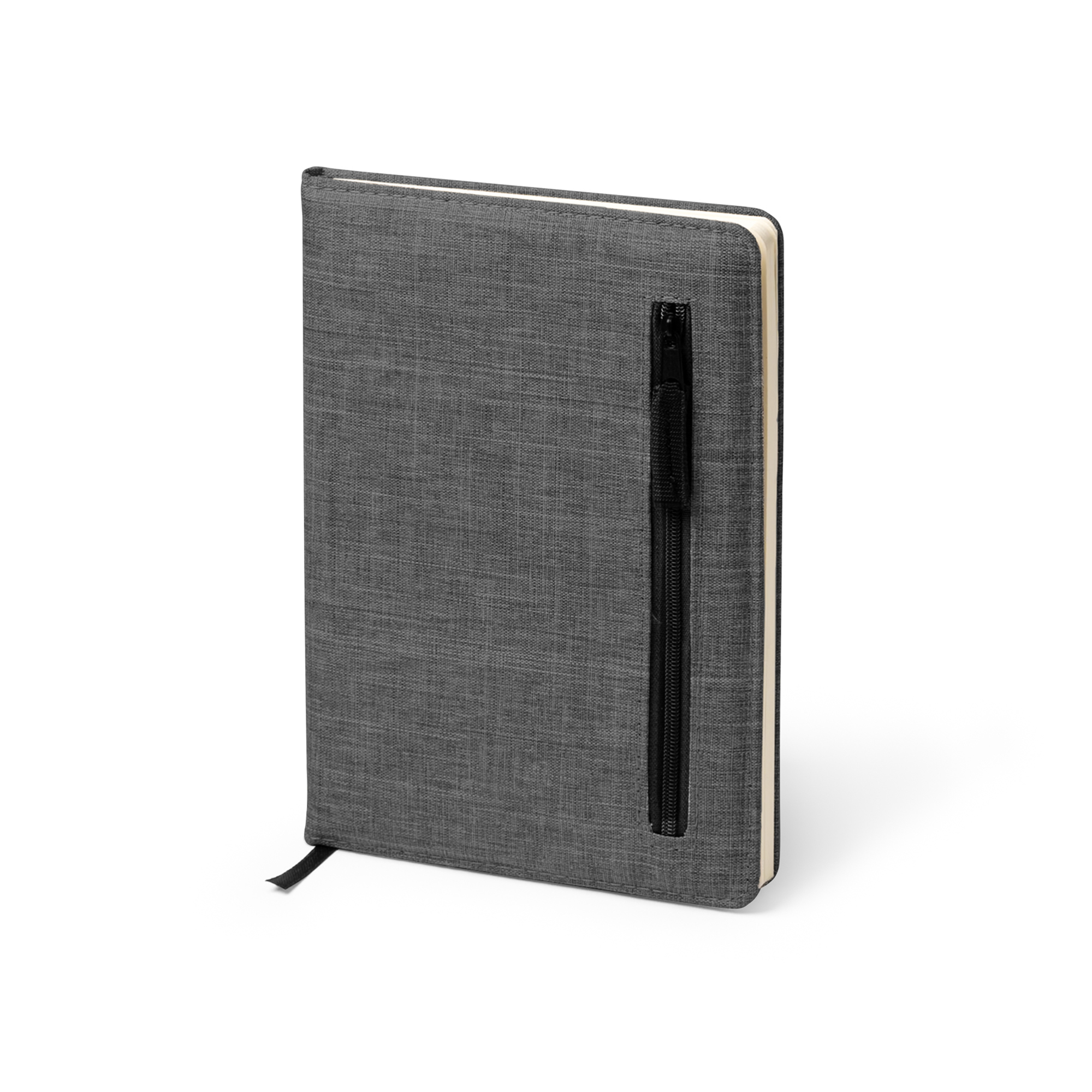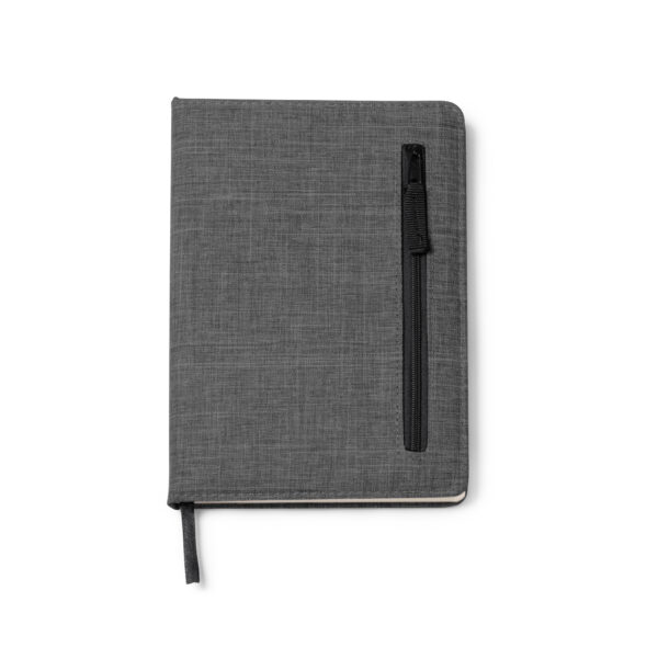 Bloc de notas A5 realizado en RPET. Bolsillo exterior con cierre de cremallera. Incluye marcapáginas. 80 hojas a rayas.Composición: RPET