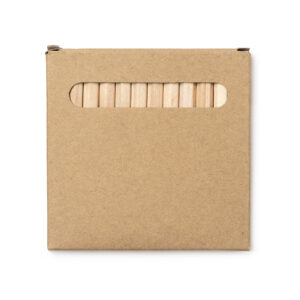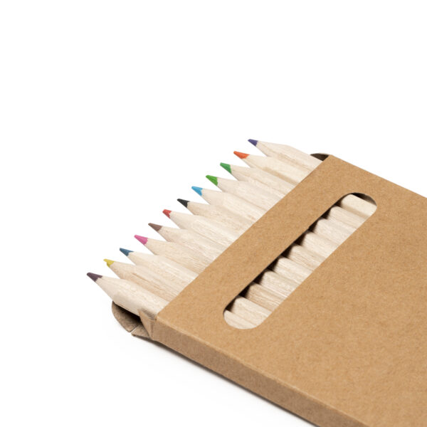Set de 12 lápices de colores de madera en caja de cartón reciclado.