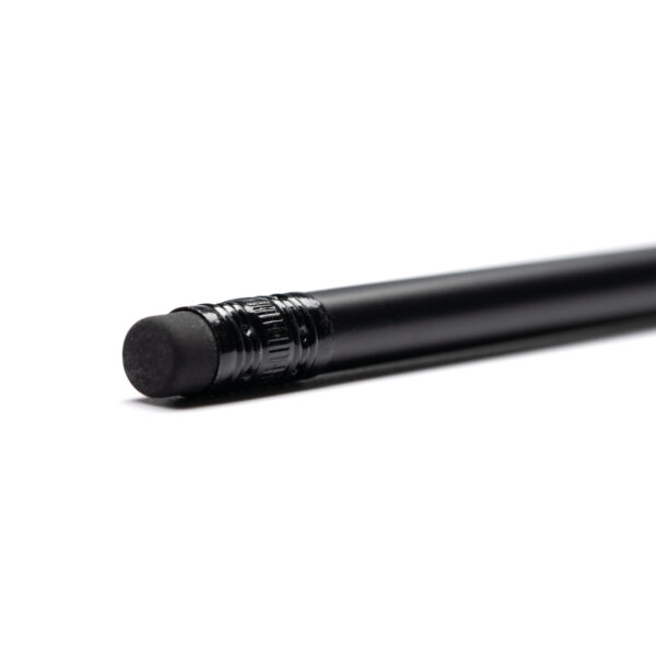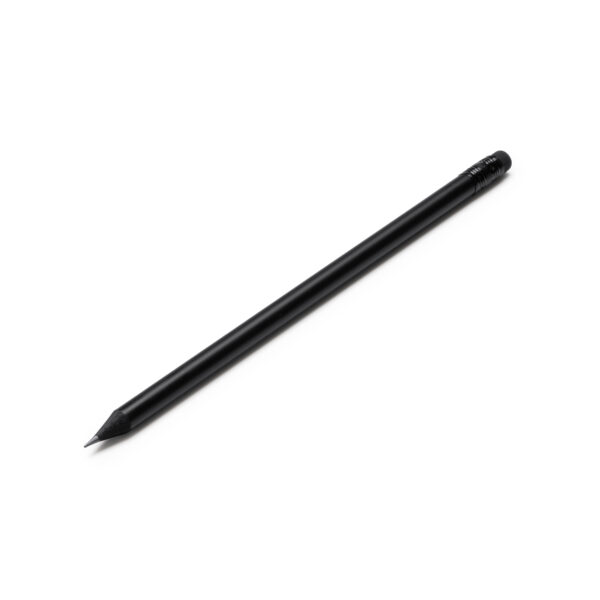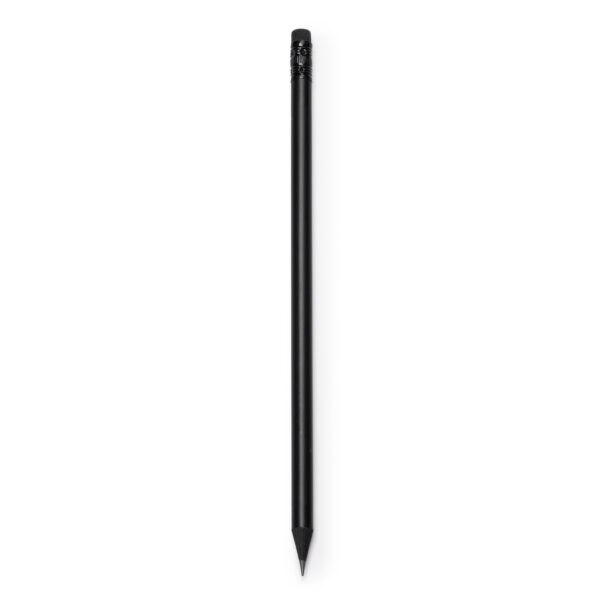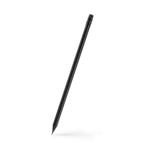 Lápiz con cuerpo elaborado en madera, color negro mate con goma y detalles a conjunto. Diseño elegante y escritura suave. Se sirve con punta afilada para ofrecer una escritura suave. Composición: Madera