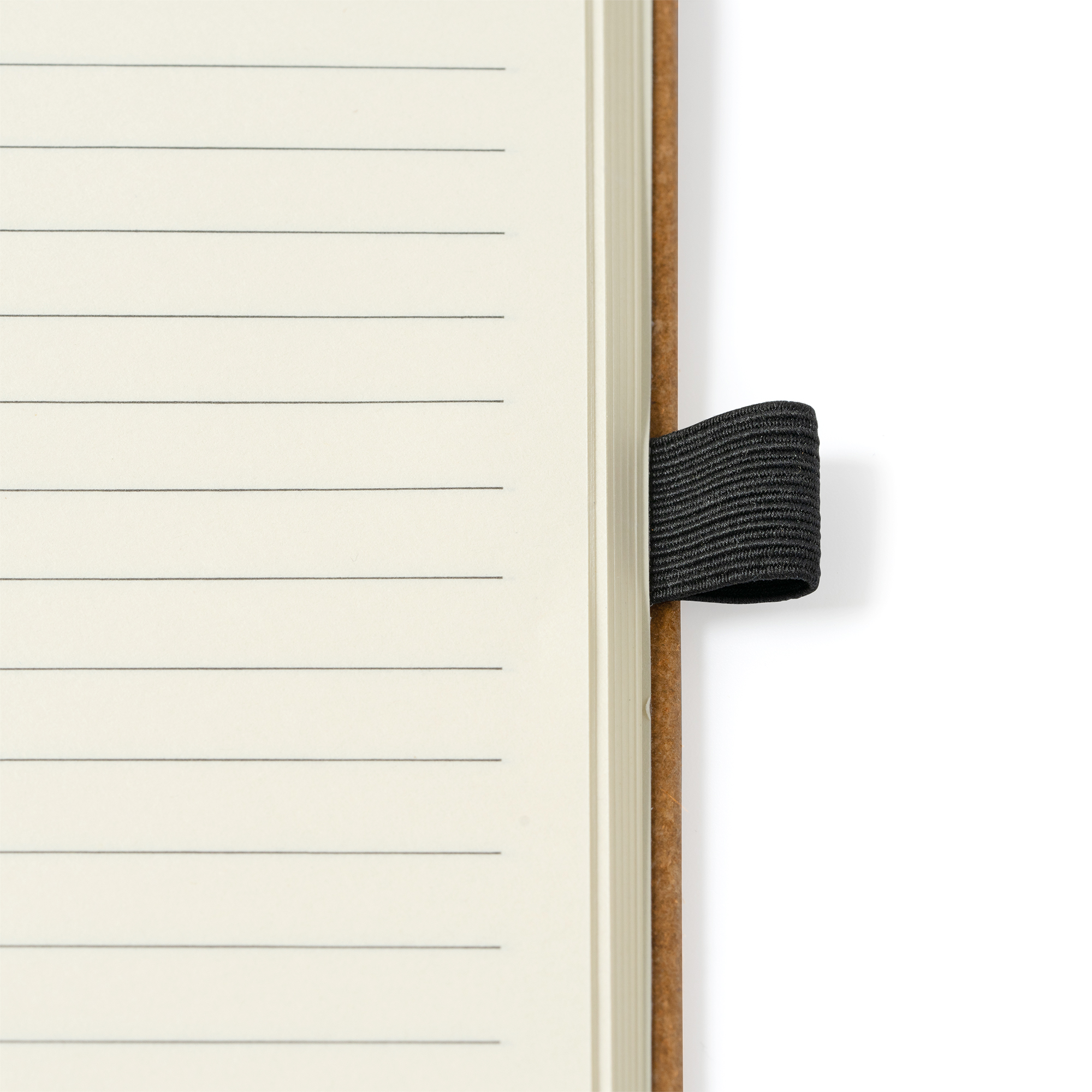 Bloc de notas A5 con tapa rígida elaborada con piel reciclada. Marcapáginas y banda elástica de cierre. Cuenta con 100 hojas a una línea.Composición: Piel reciclada