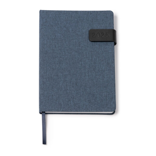 Agenda tamaño A5 realizada con poliéster reciclado RPET con cubierta magnética. 320 páginas más 4 páginas con mapas. Marcador de páginas en color a juego con la portada. Impresión a color 2+2. Papel interior de color blanco.