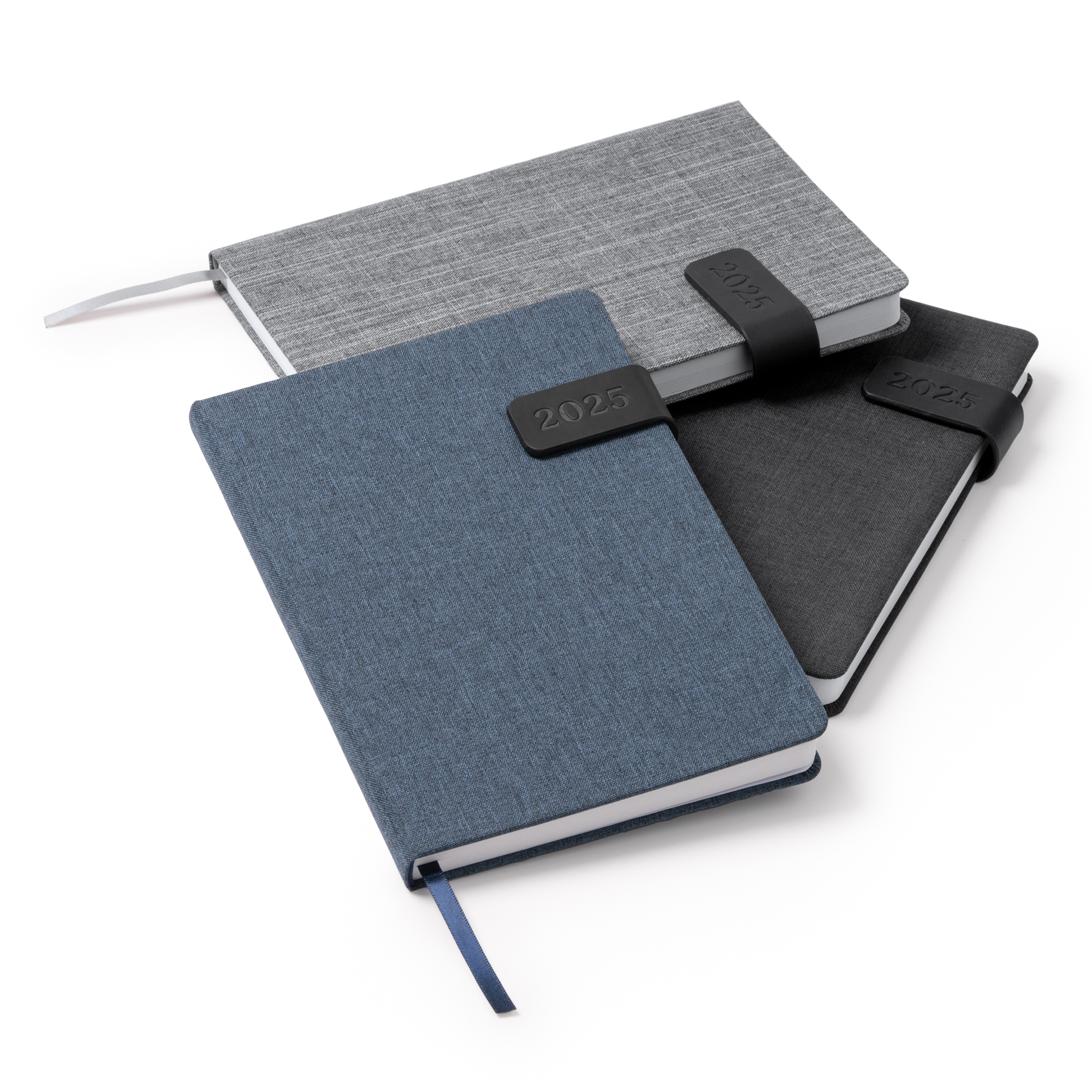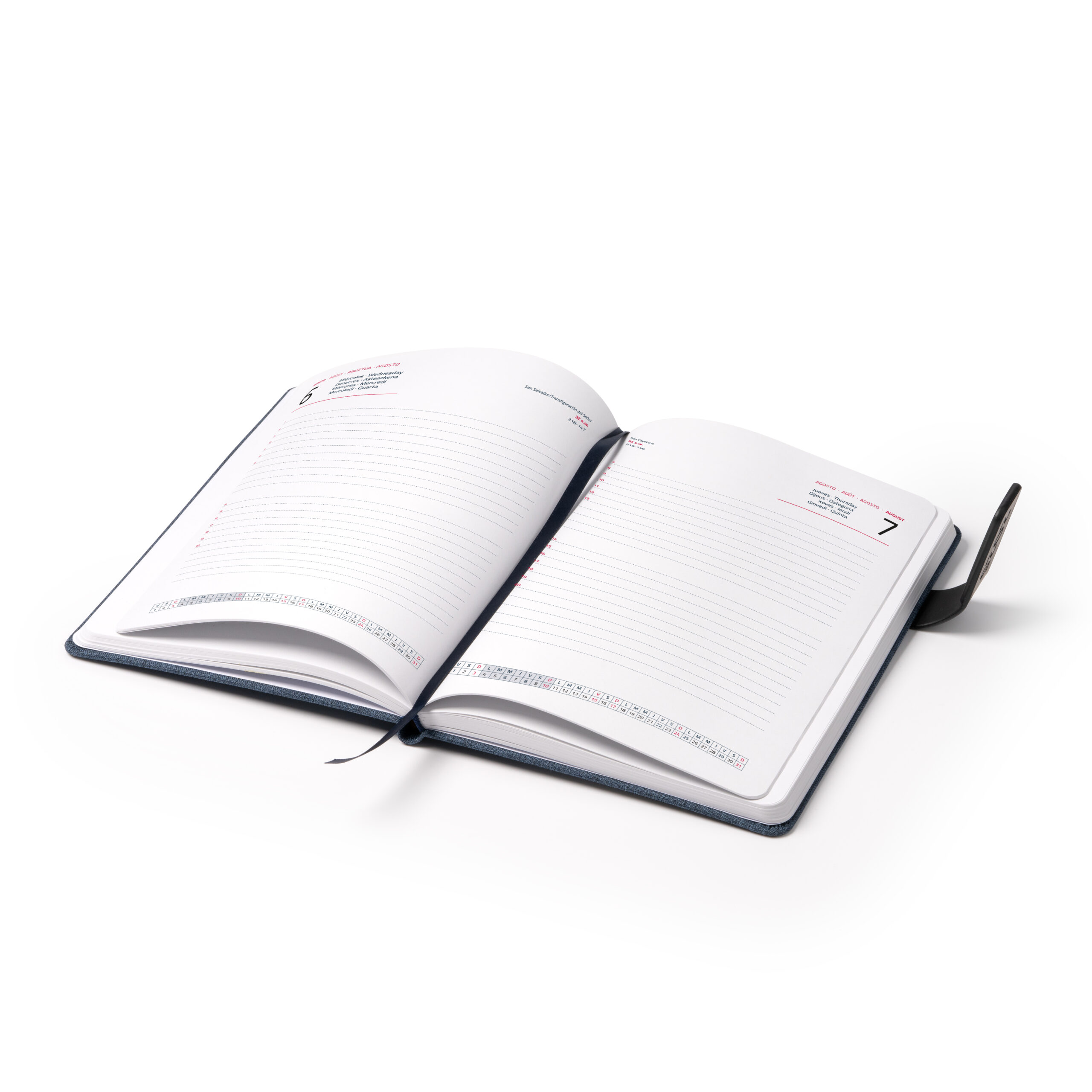 Agenda tamaño A5 realizada con poliéster reciclado RPET con cubierta magnética. 320 páginas más 4 páginas con mapas. Marcador de páginas en color a juego con la portada. Impresión a color 2+2. Papel interior de color blanco.