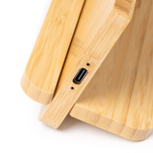 Soporte cargador vertical 3 en 1 realizado en bambú, con 15W de potencia. Función de carga para smartphones, smartwatches y auriculares inalámbricos. Con indicadores luminosos de carga. Con entrada Tipo C para conexión a corriente. Cable Tipo C incluido.