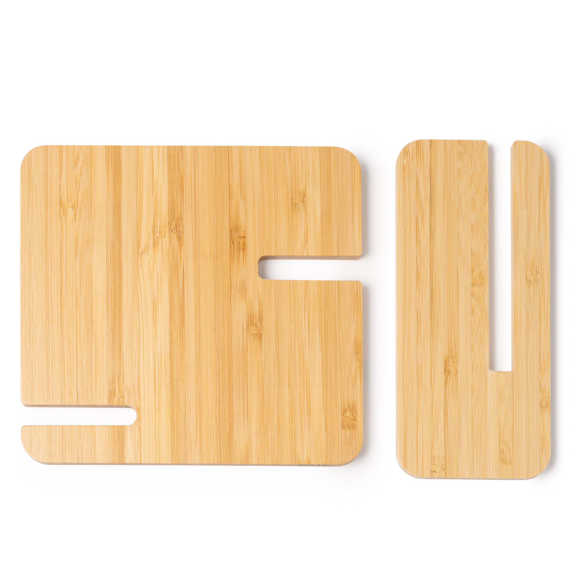 Soporte cargador vertical 3 en 1 realizado en bambú, con 15W de potencia. Función de carga para smartphones, smartwatches y auriculares inalámbricos. Con indicadores luminosos de carga. Con entrada Tipo C para conexión a corriente. Cable Tipo C incluido.