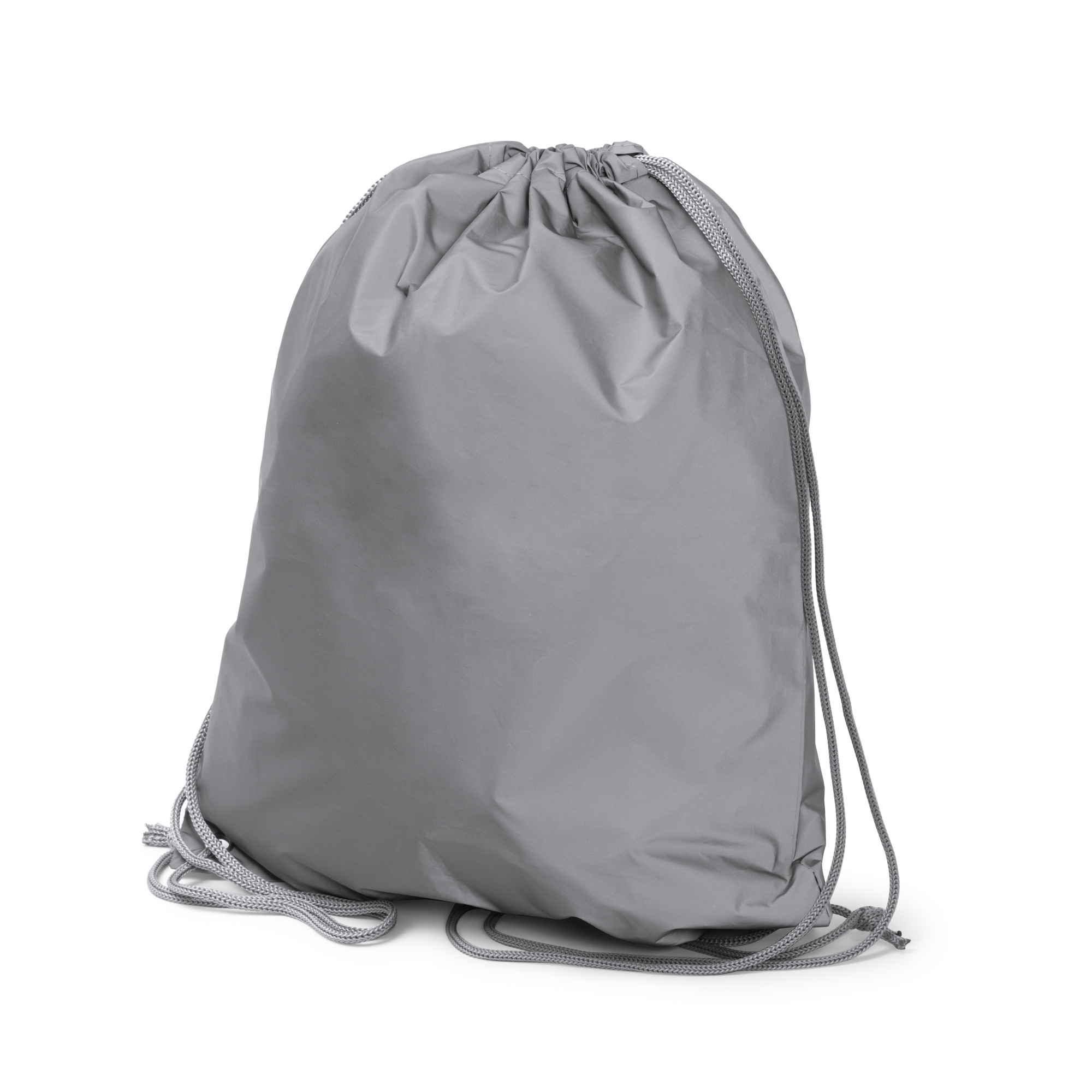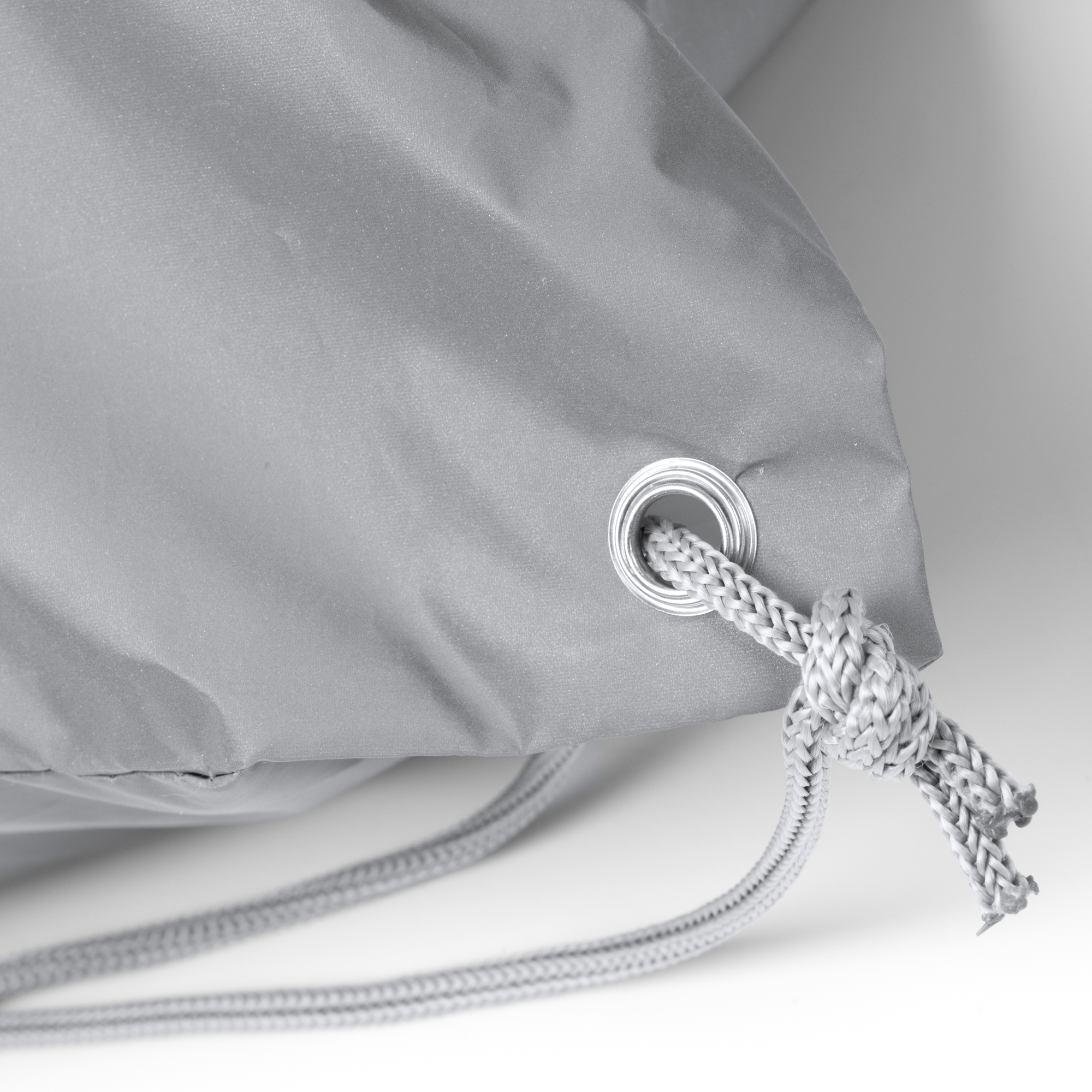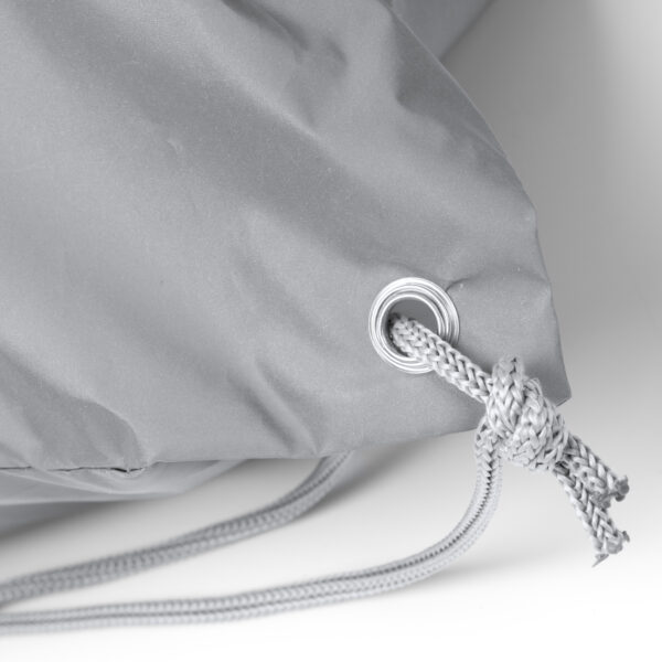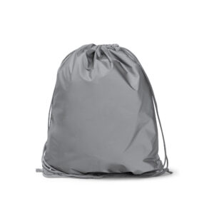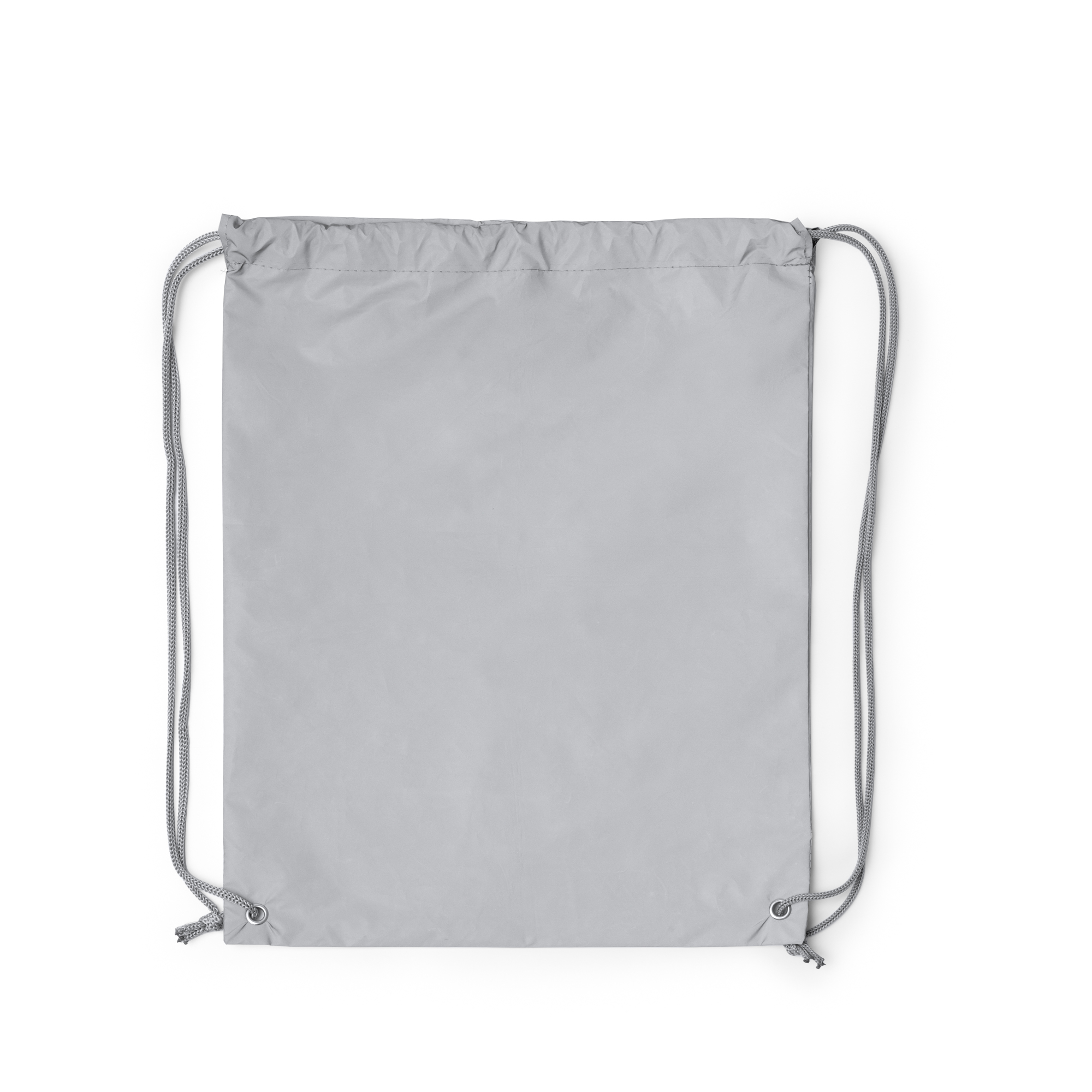 Mochila de cuerdas reflectante realizada en suave poliéster 210D. Resistente hasta 7kg y material repelente al agua. Con ojales reforzados en metal. Composición: Poliéster 210D