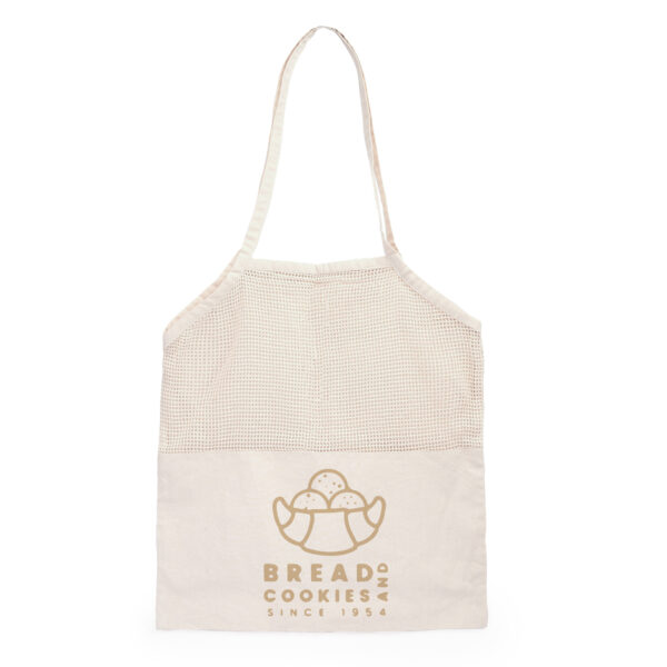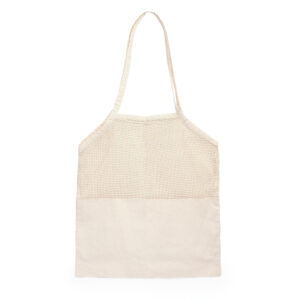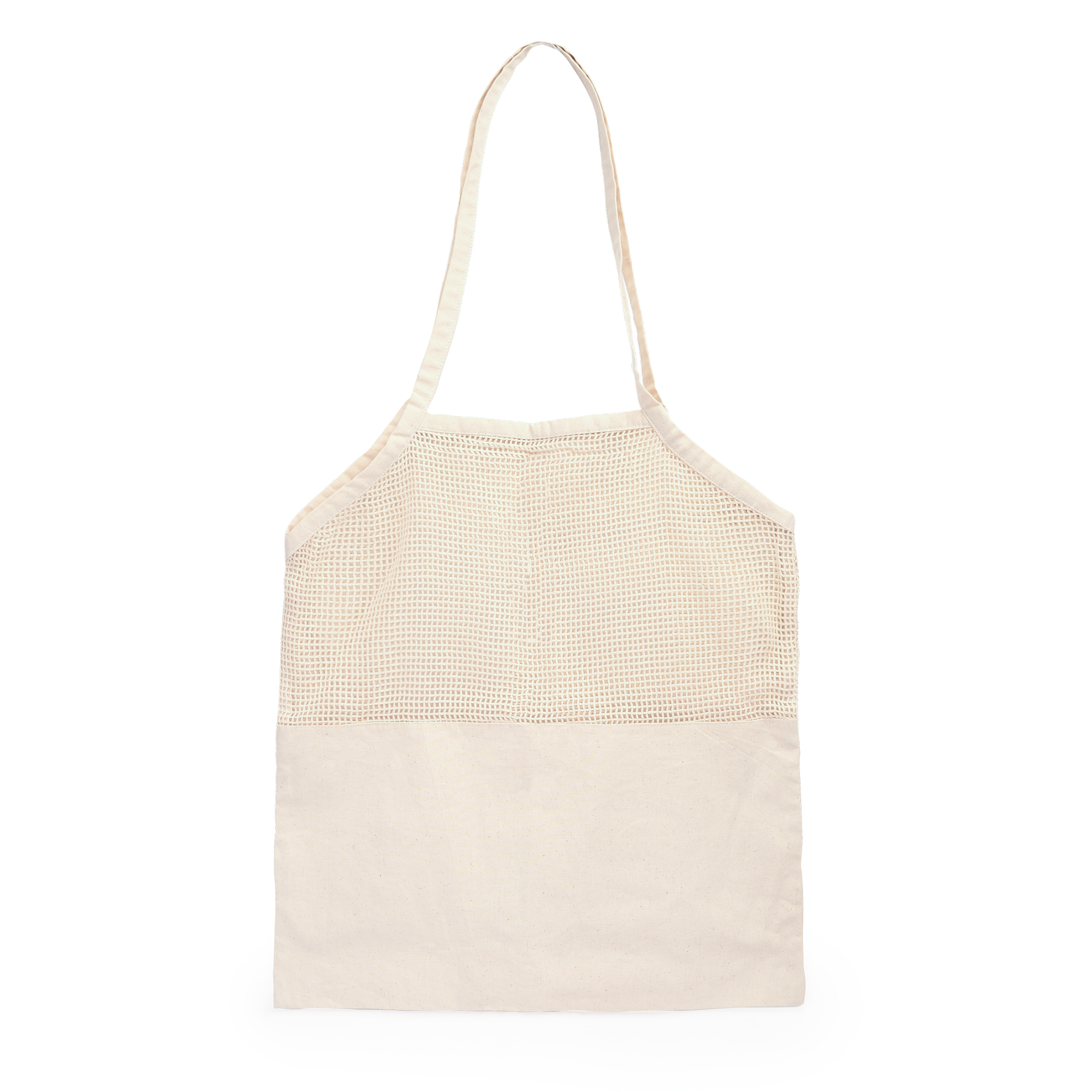 Bolsa para fruta 100% algodón en color natural con asas de 60 cm. Con un diseño que combina en mitad de la bolsa material suave y mitad en rejilla. Forma ergonómica para mejor transporte de productos. Composición: 100% Algodón 180 g/m²