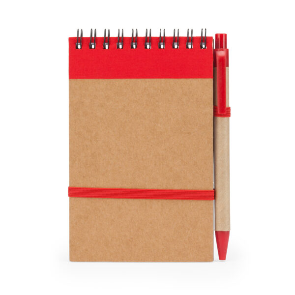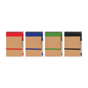 Libreta con espiral y tapa rígida de cartón reciclado. Incluye bolígrafo a juego con tinta azul. 70 hojas.