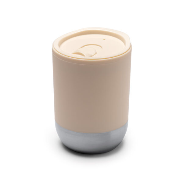 Vaso con cuerpo de PP reciclado de doble pared y base de acero inoxidable 304. Incluye tapa dosificadora. Capacidad 290 ml.