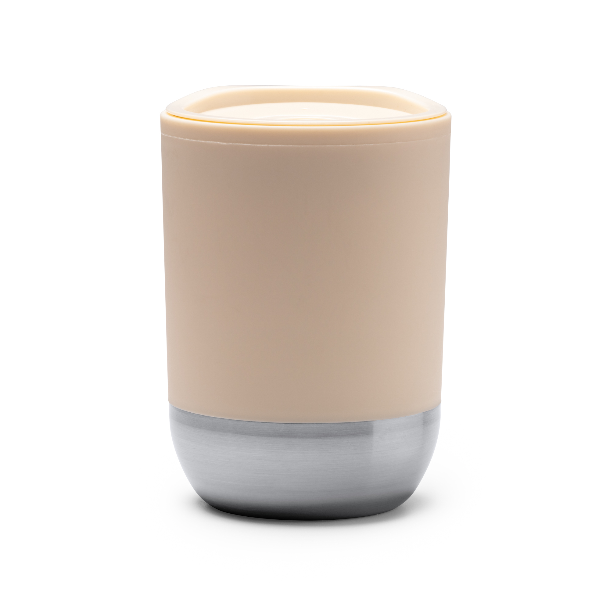 Vaso con cuerpo de PP reciclado de doble pared y base de acero inoxidable 304. Incluye tapa dosificadora. Capacidad 290 ml.