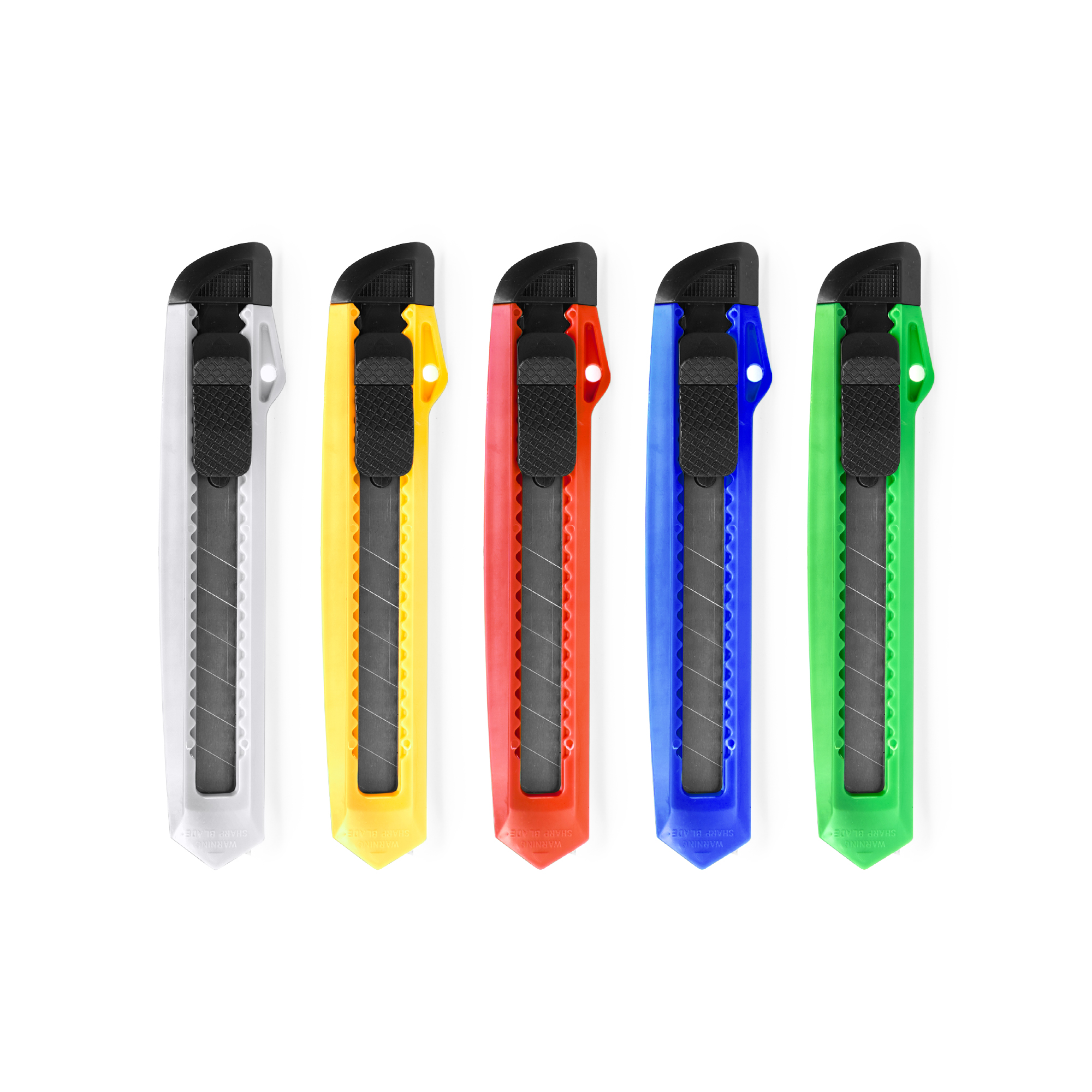 Cutter de cuchilla ancha y cuerpo de ABS. Agarre ergonómico troquelado y capucha extraíble para el corte y ajuste de la cuchilla.Composición: Plástico
