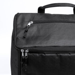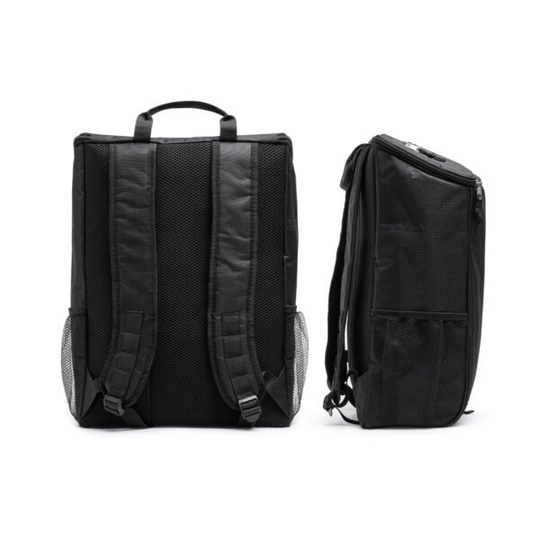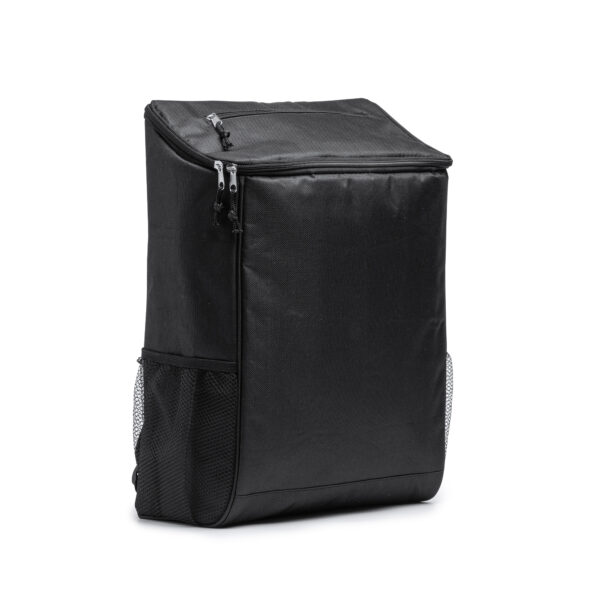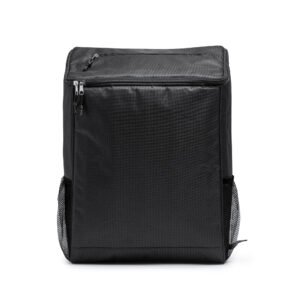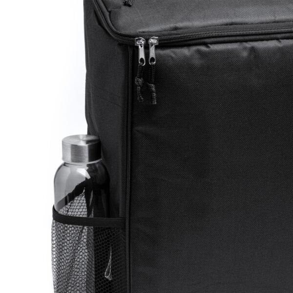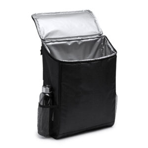 Mochila nevera realizada en RPET idónea para mantener tu bebida o comida en buena temperatura. Cuenta con un bolsillo principal con interior isotérmico y bolsillo en la solapa. Tiene además, dos bolsillos laterales de rejilla en los laterales ideales para el transporte de botellas. Con espalda y tiras acolchadas para mayor comodidad en su uso.