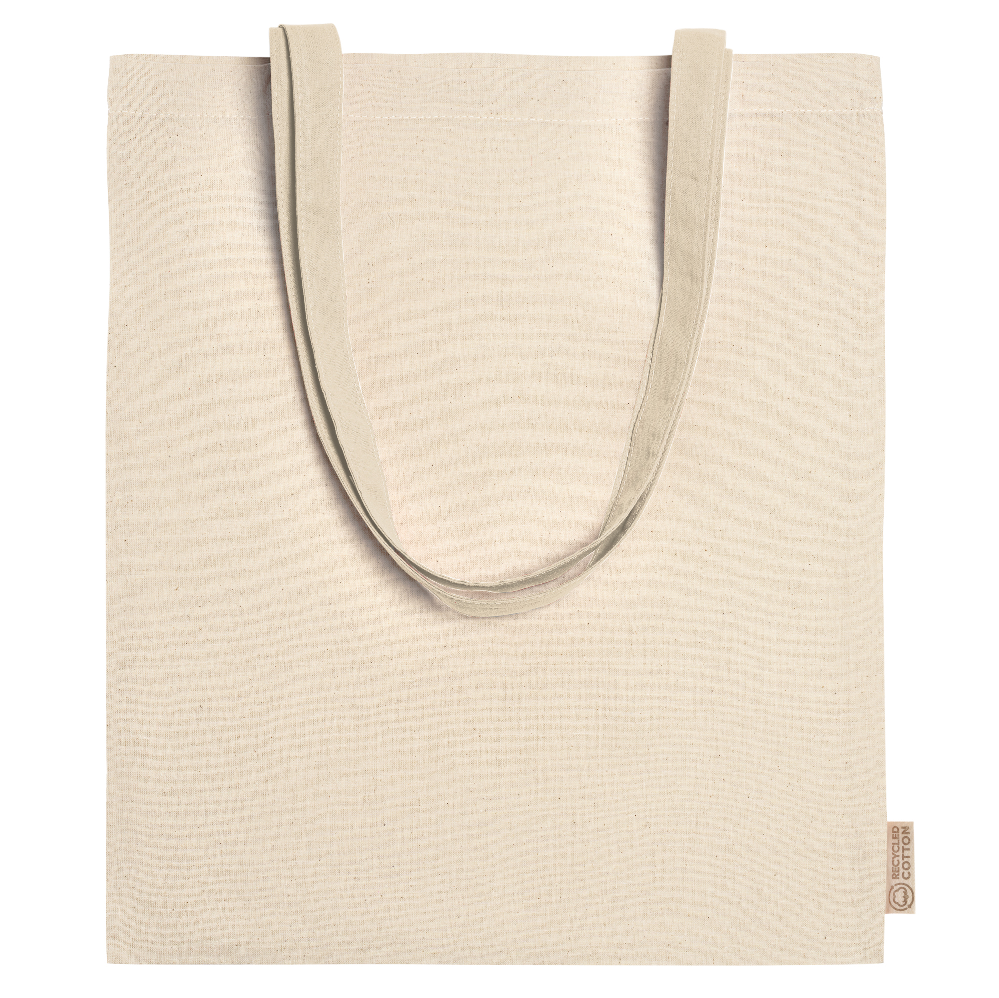 Bolsa elaborada en 70% algodón reciclado y 30% poliéster reciclado. Con asas largas de 70cm. Es una opción sostenible y práctica para llevar objetos de diversa índole a cualquier lado.