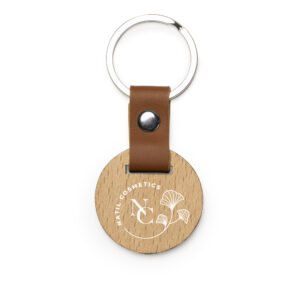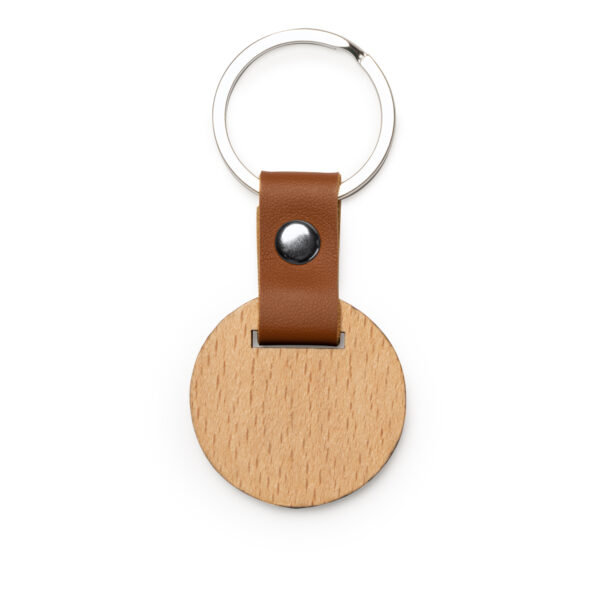 Llavero de madera natural en dos formatos, redondo y ovalado, con terminaciones en elegante polipiel y remaches efecto metalizado.
