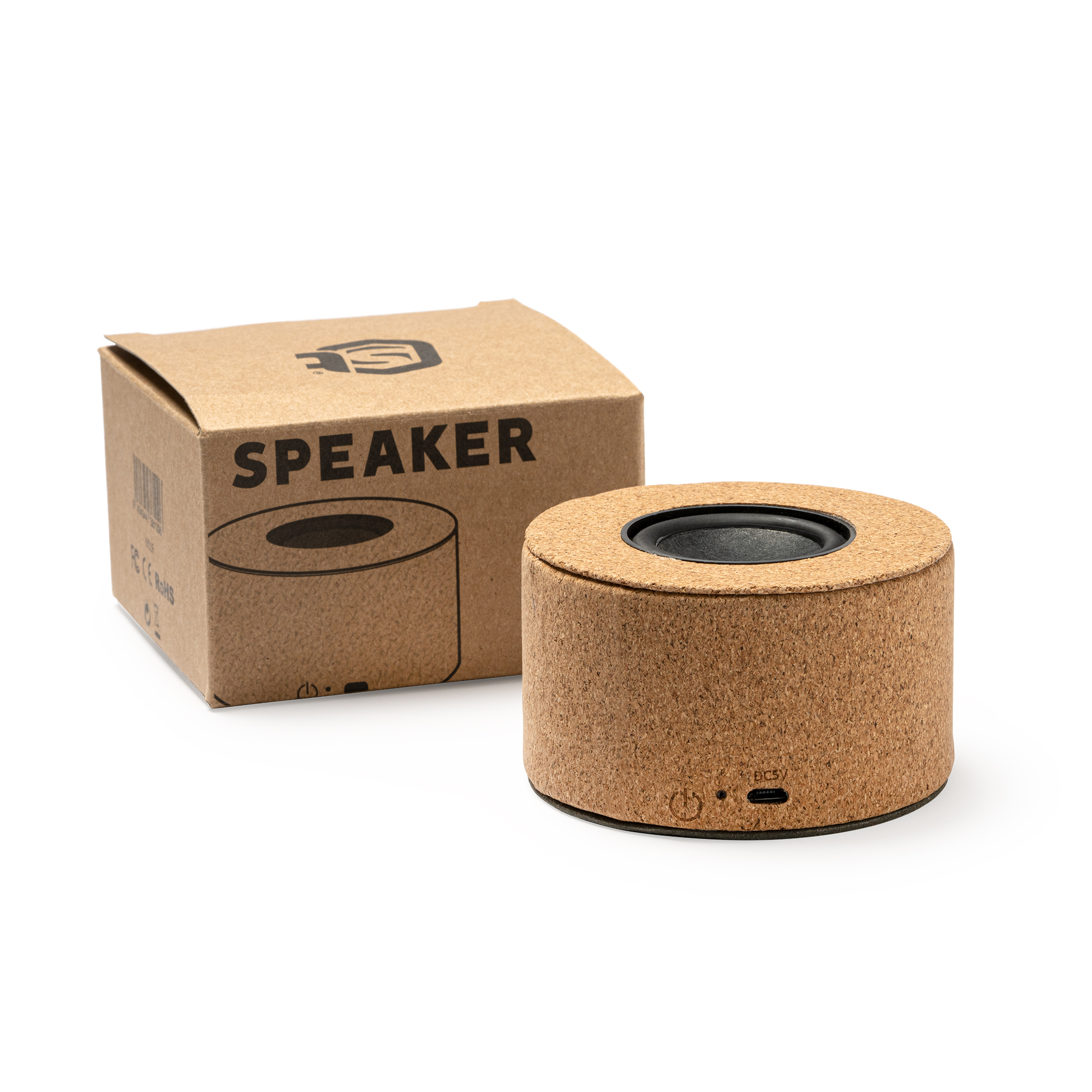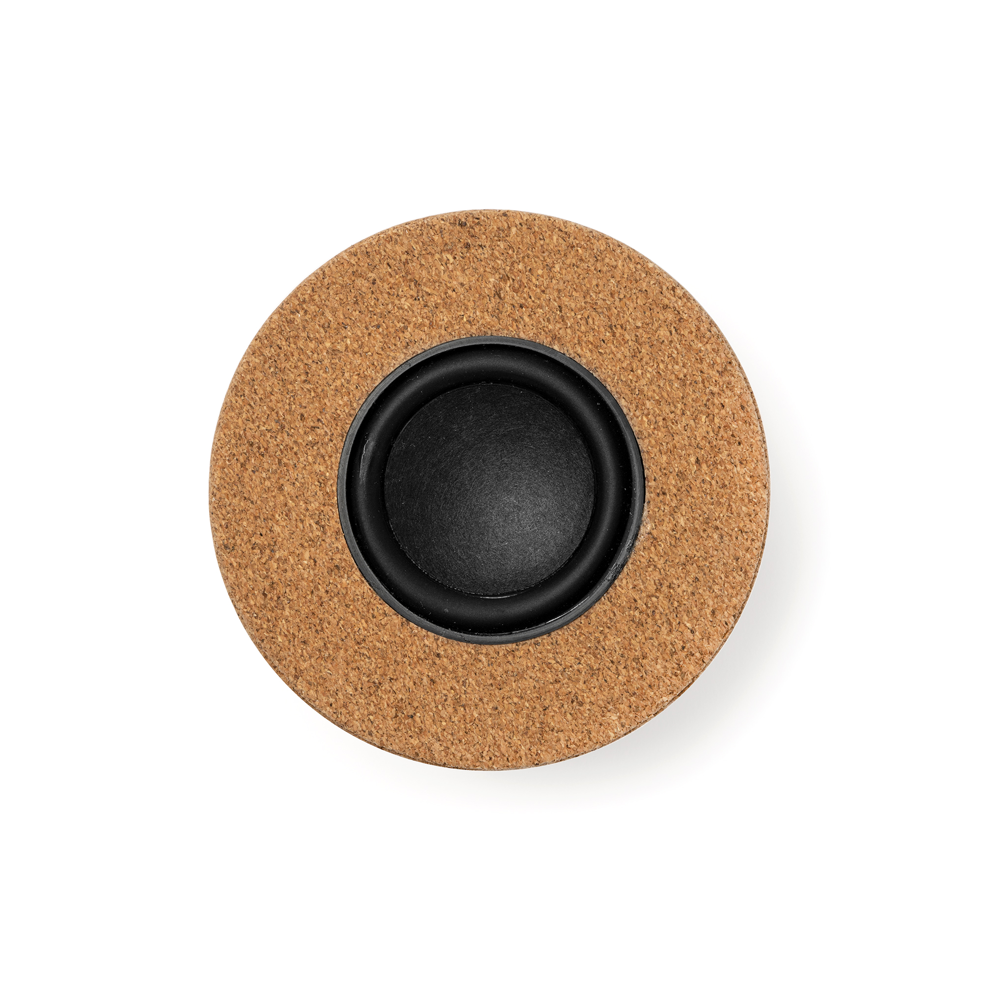 Altavoz inalámbrico fabricado en de corcho natural. Con membrana de altavoz visible en la superficie. Con potencia de 3W y batería recargable con cable USB Tipo C. Cuenta con indicador luminoso de encendido/apagado, salida de audio vía Bluetooth y función de manos libres. Tiempo en funcionamiento continuo de hasta 4 horas.
