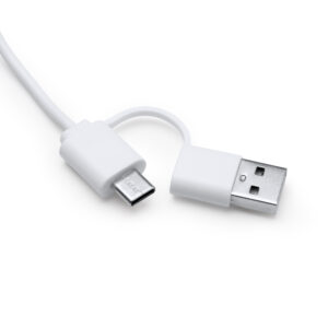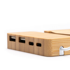 Puerto USB elaborado en bambú. Incluye cuatro puertos: dos tipo USB y dos Tipo C. Cable USB incorporado con adaptador a Tipo C. Cuenta con soporte para dispositivos y un práctico bloc de notas de 130 hojas.