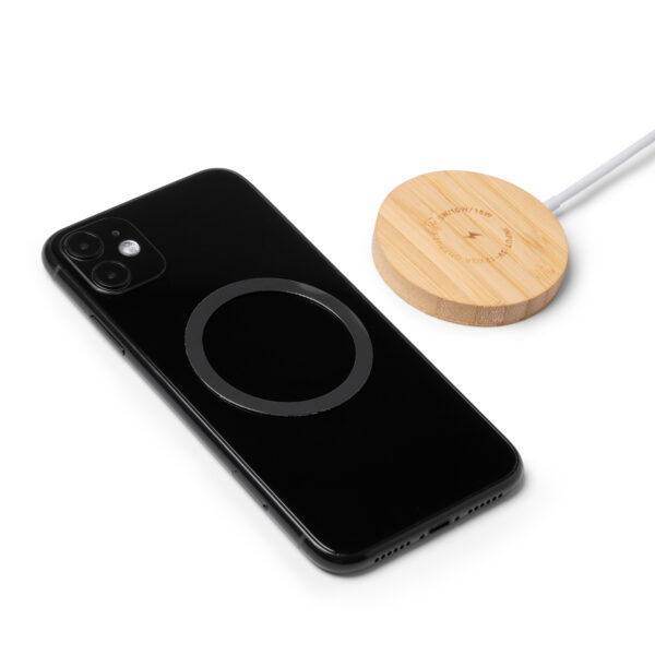 Cargador inalámbrico elaborado en bambú. Con función magnética en superficie mediante anillo magnético. Potencia de carga de 15W. Compatible con dispositivos provistos de tecnología de carga inalámbrica. Incluye anillo accesorio adhesivo.