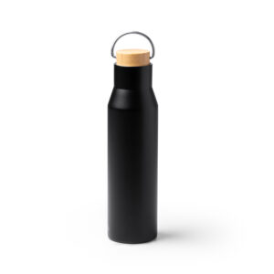 Bidón térmico de acero inoxidable 304 reciclado doble pared y tapa de bambú con asa. Capacidad 550 ml.