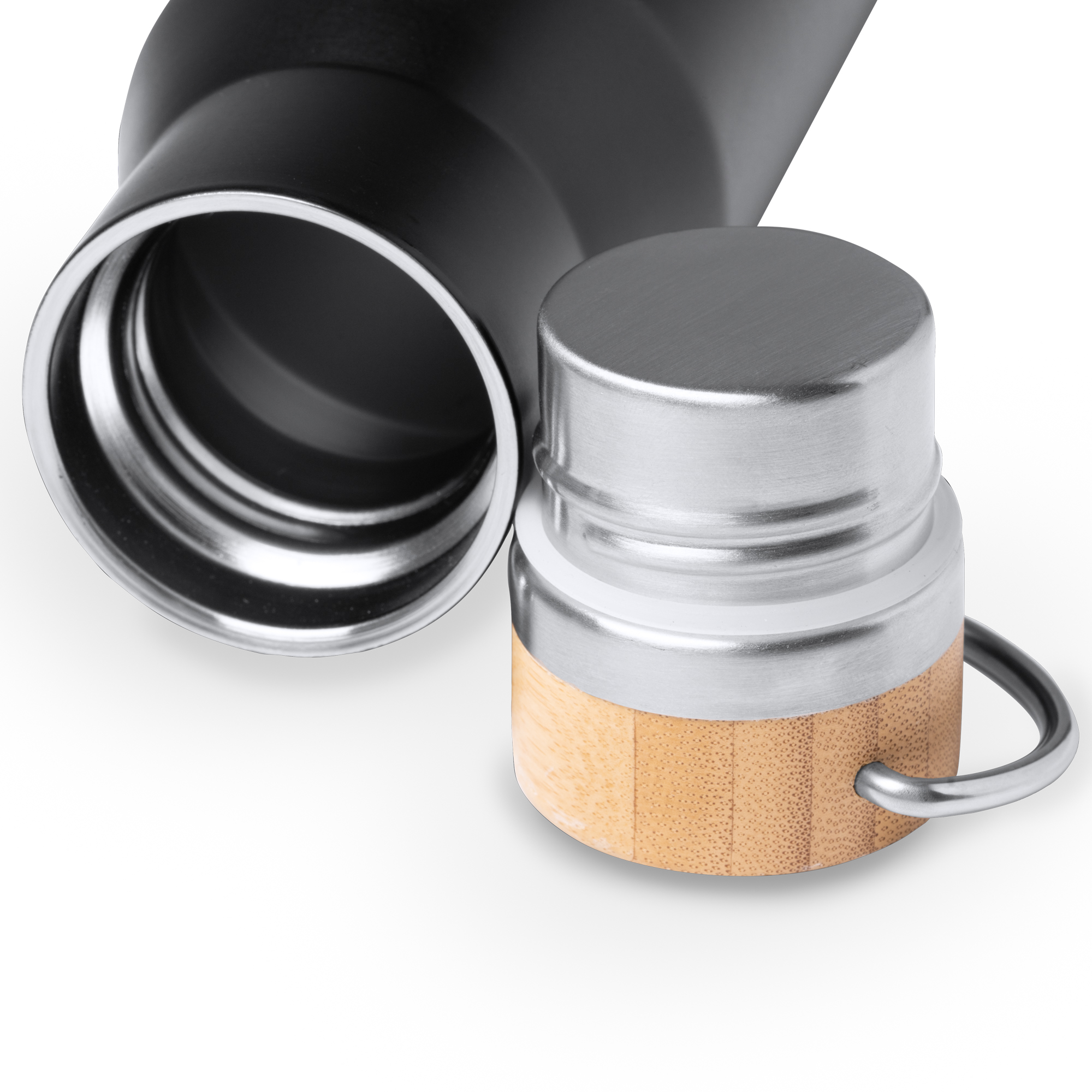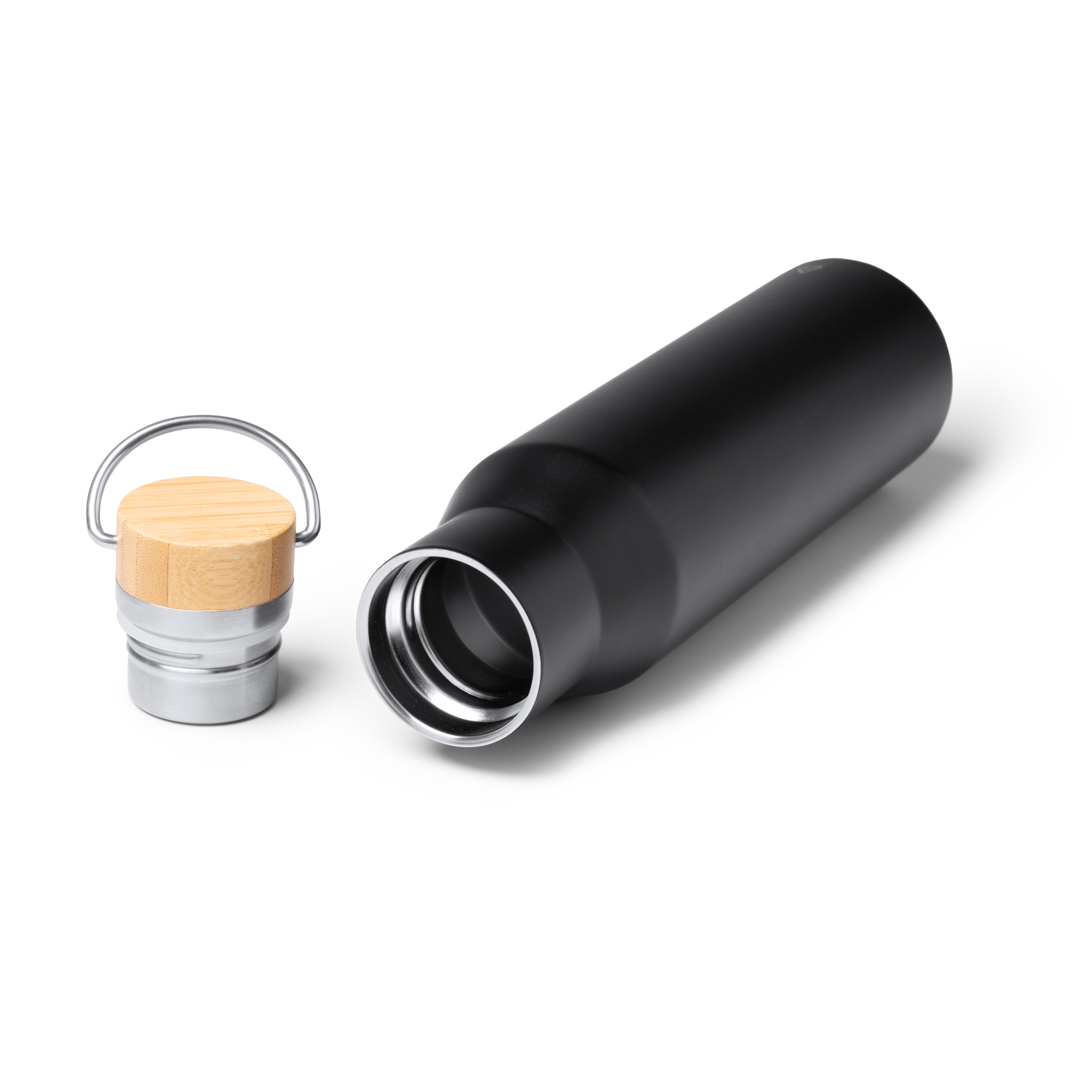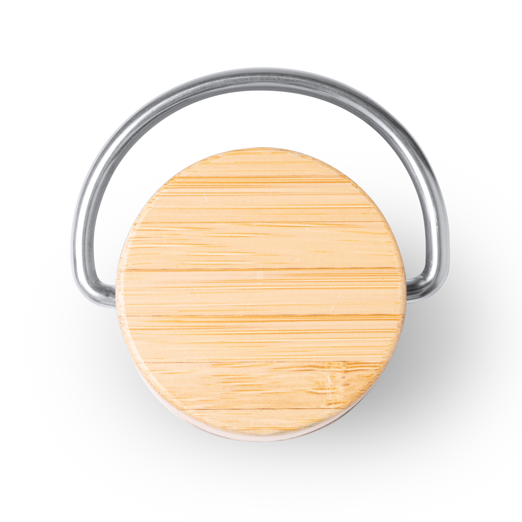 Bidón térmico de acero inoxidable 304 reciclado doble pared y tapa de bambú con asa. Capacidad 550 ml.