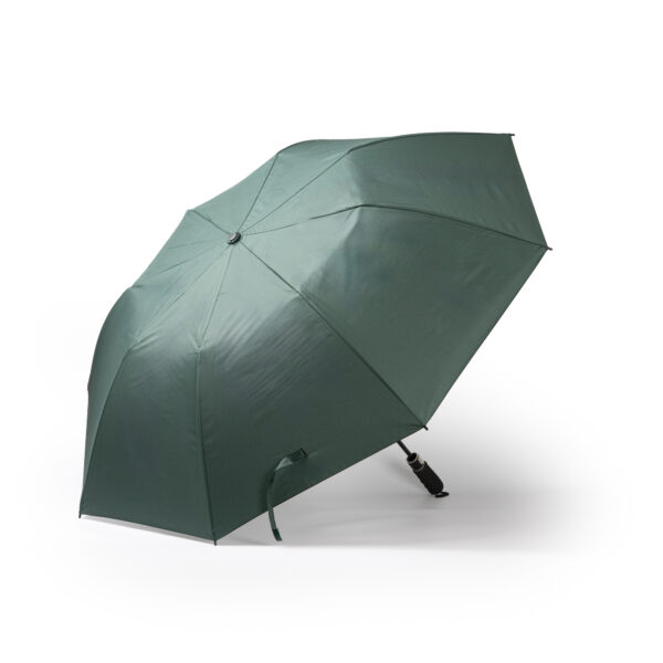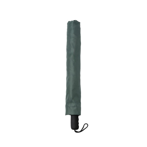 Paraguas plegable realizado en RPET con apertura automática gracias a su botón incorporado en el mango. Elaborado en tejido pongee 210T. Con varillas de fibra de vidrio con sistema antiventisca y mango en EVA. Este sistema refuerza la funcionalidad del paraguas en los días de mayor temporal. Cuenta con cierre de velcro, tira de transporte y una funda a juego.