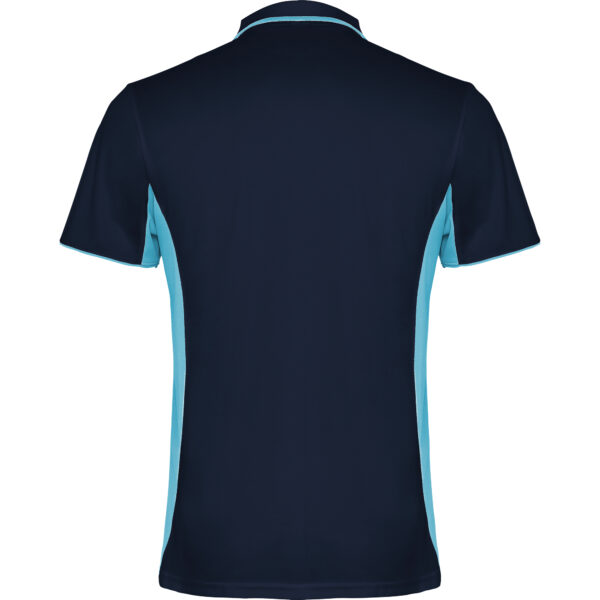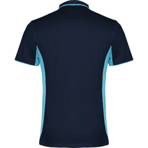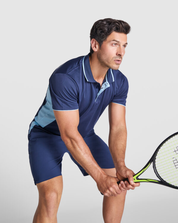 Polo técnico manga corta transpirable bicolor. Paneles laterales y en sisa. Cuello rib 1×1 al tono con detalle a contraste. Vivo del mismo tejido en bocamanga. Tapeta con 3 botones. Cubrecosturas del mismo tejido a contraste. Certificado UV.
