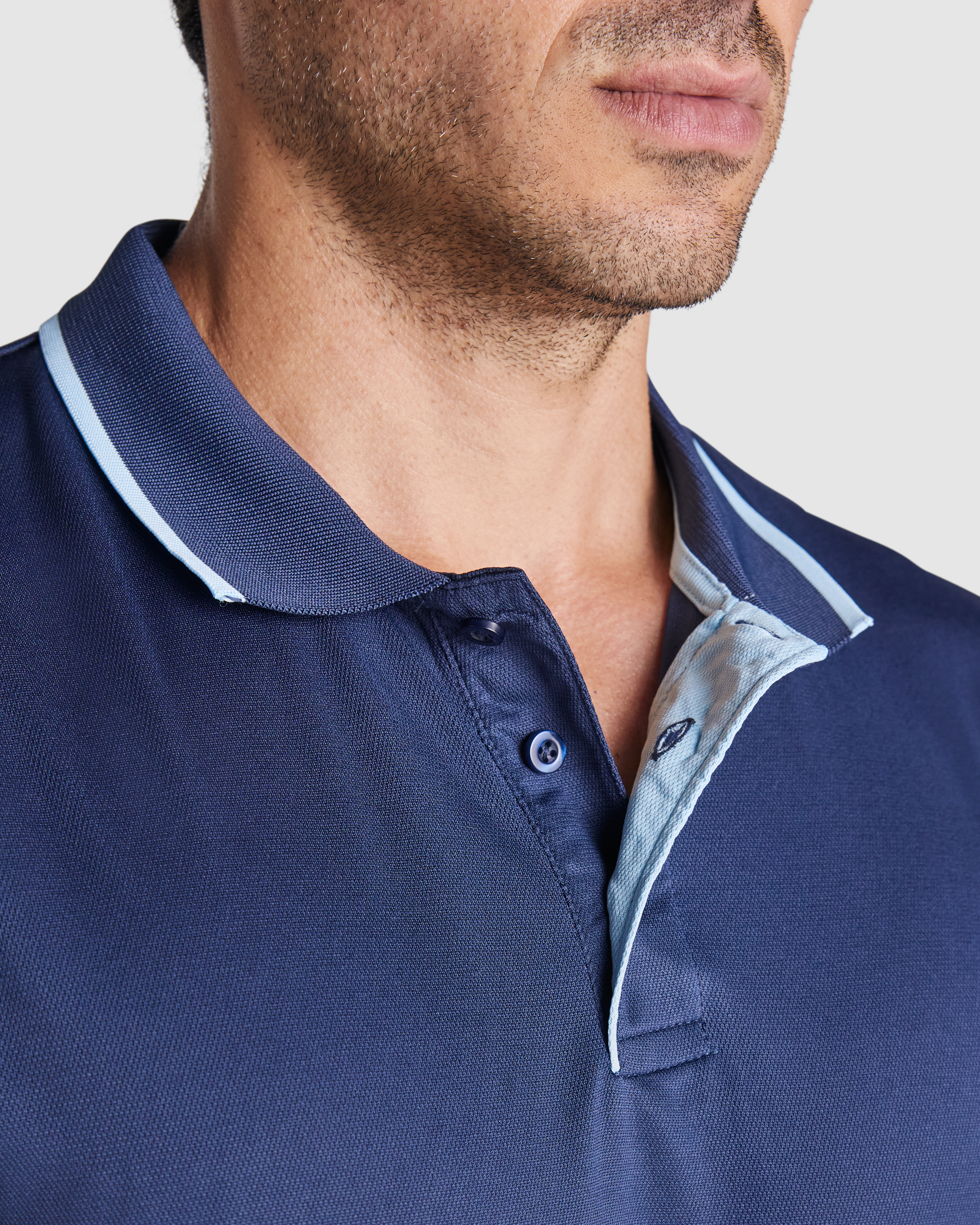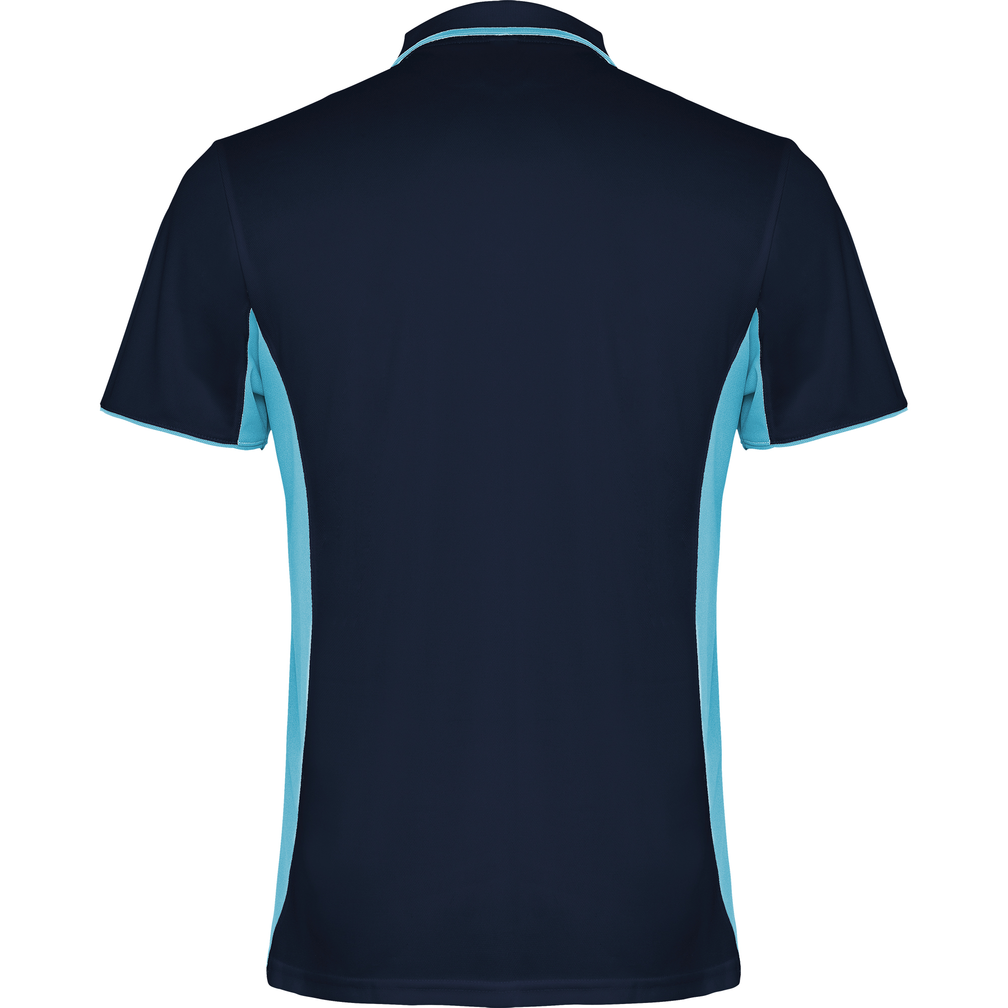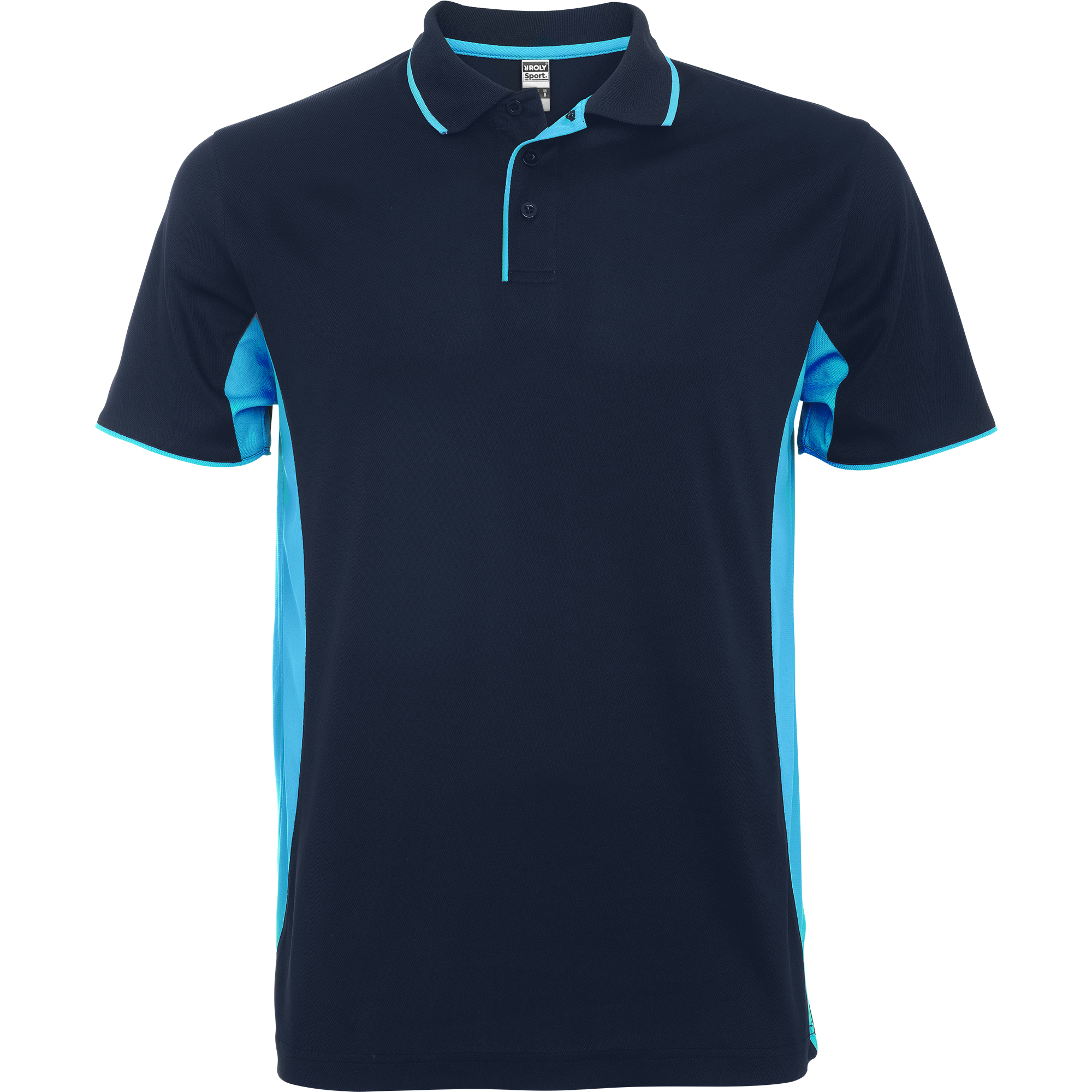 Polo técnico manga corta transpirable bicolor. Paneles laterales y en sisa. Cuello rib 1×1 al tono con detalle a contraste. Vivo del mismo tejido en bocamanga. Tapeta con 3 botones. Cubrecosturas del mismo tejido a contraste. Certificado UV.