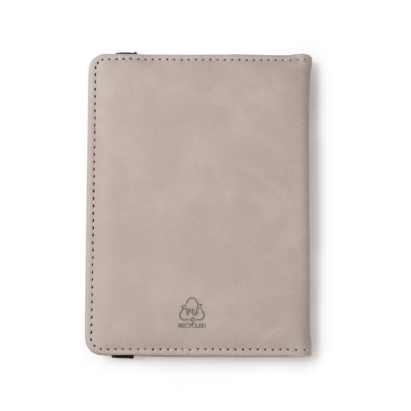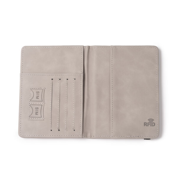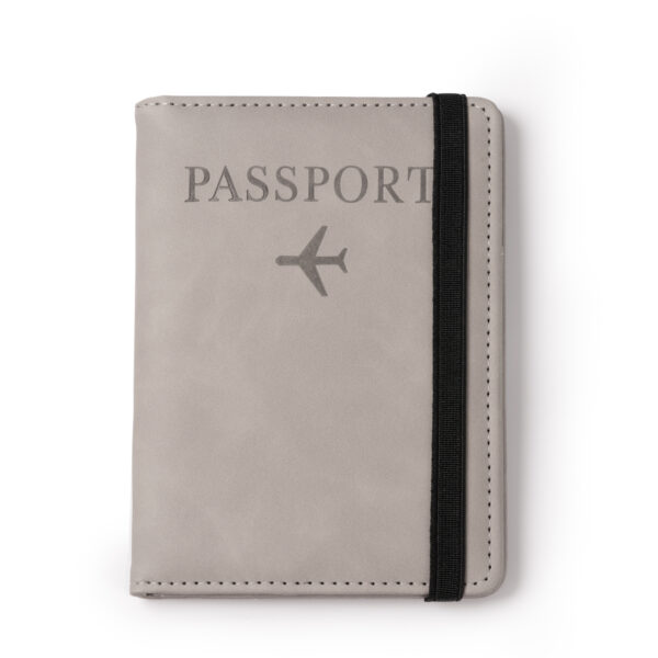 Funda para pasaporte realizada en PU Leather con banda elástica de cierre. Está equipado con 3 bolsillos interiores para pasaporte y documentos, 4 bolsillos para tarjetas y 2 para tarjetas SIM.