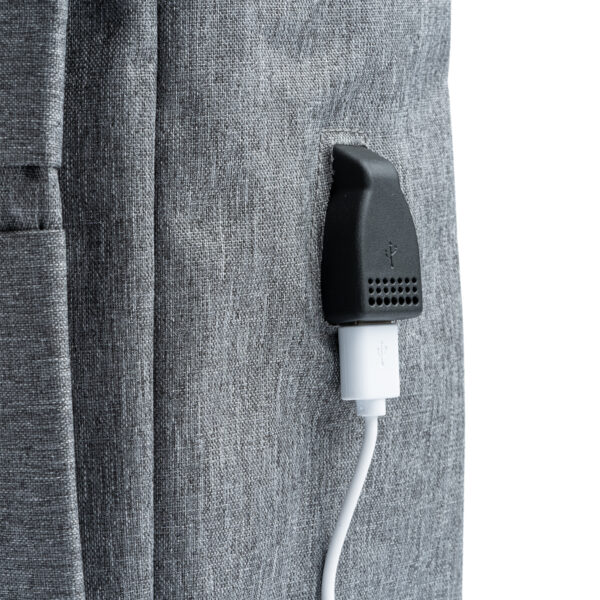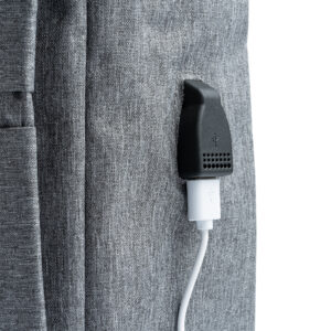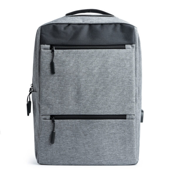 Mochila promocional realizada en poliéster 300D. Acabado OXFORD de diseño innovador. Bolsillo principal acolchado ideal para portátil y dos bolsillos frontales con elegantes tiradores. Incluye salida USB para conectar un power bank (no incluido) Tiras y espalda acolchada.