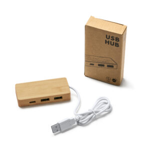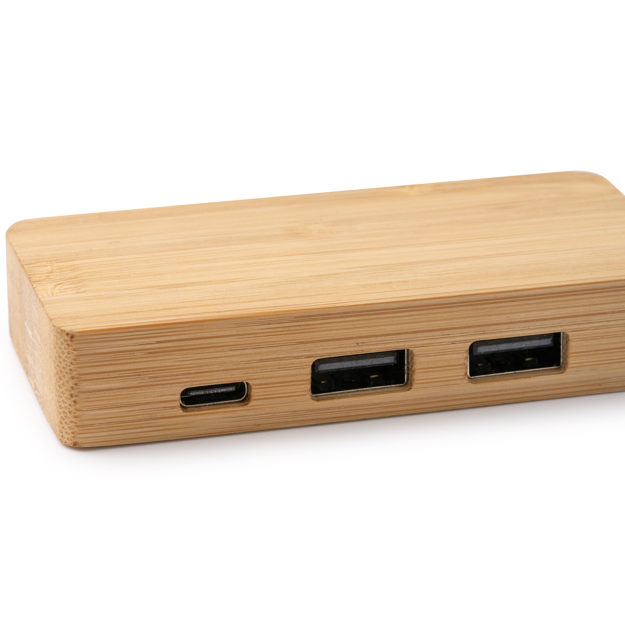 Puerto USB realizado en bambú. Dos salidas USB y una salida Tipo C. Con conexión a dispositivo mediante USB integrado.
