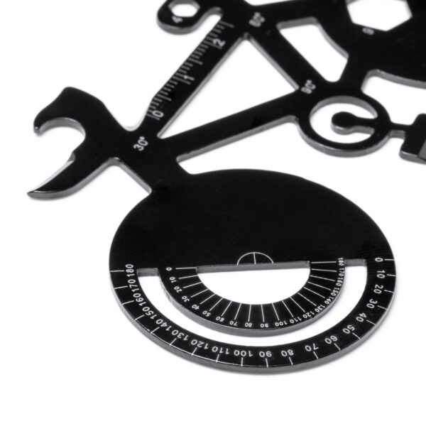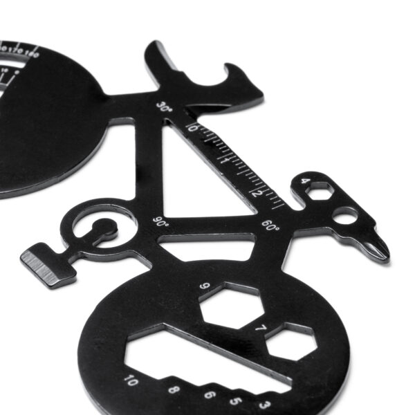 Multiherramientas de acero inoxidable con forma de bicicleta. 11 funciones: abre latas, transportador de ángulos, destornilladores, llave inglesa y reglas.Composición: Acero inoxidable
