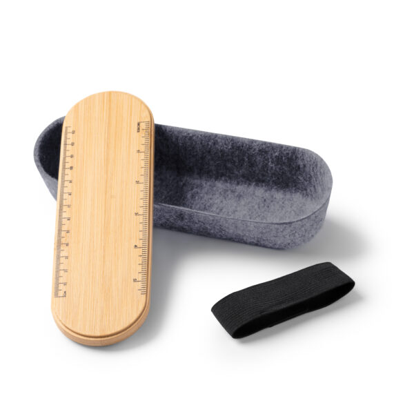 Estuche con tapa de bambú y cuerpo realizado en fieltro reciclado. Tapa con función de regla y soporte para smartphone.