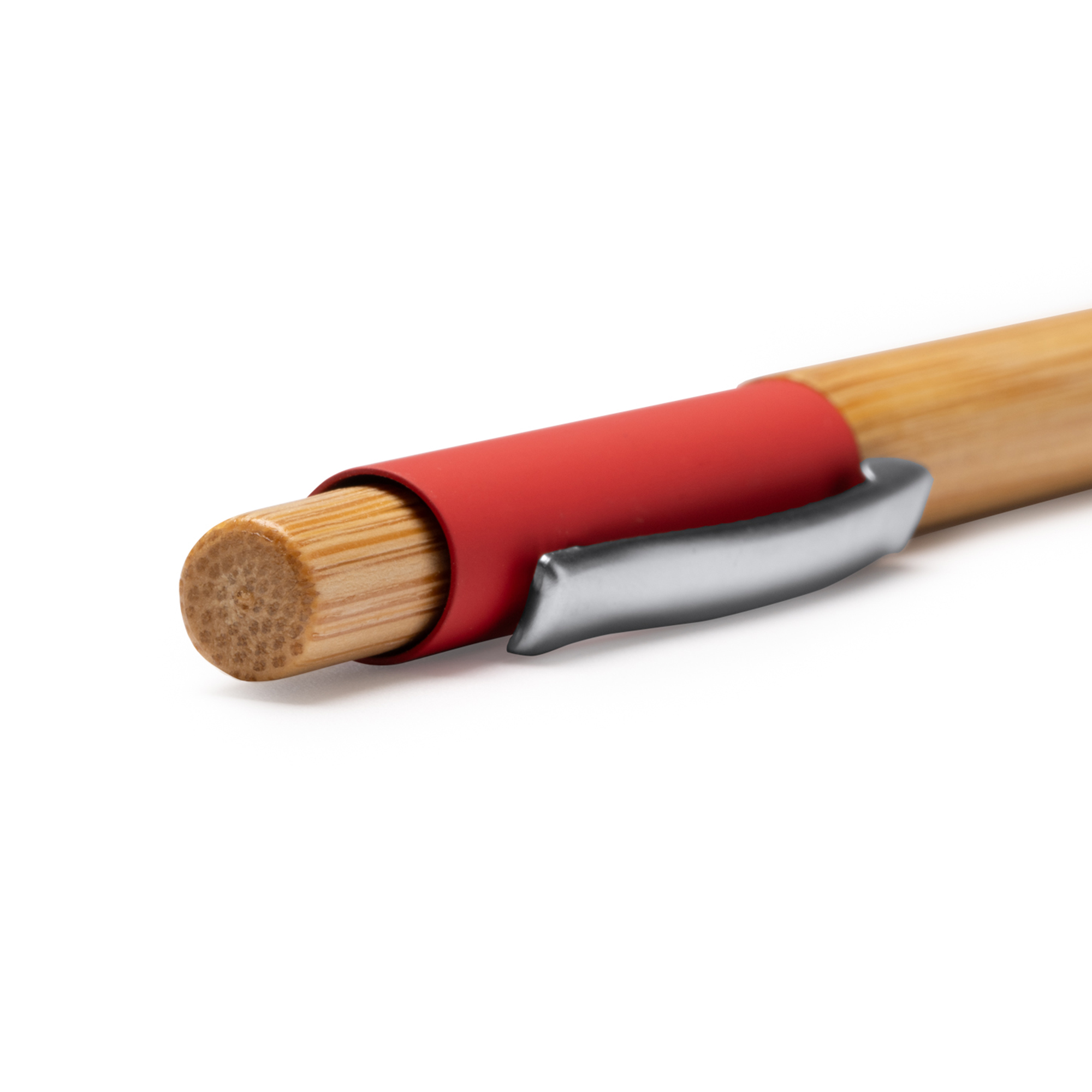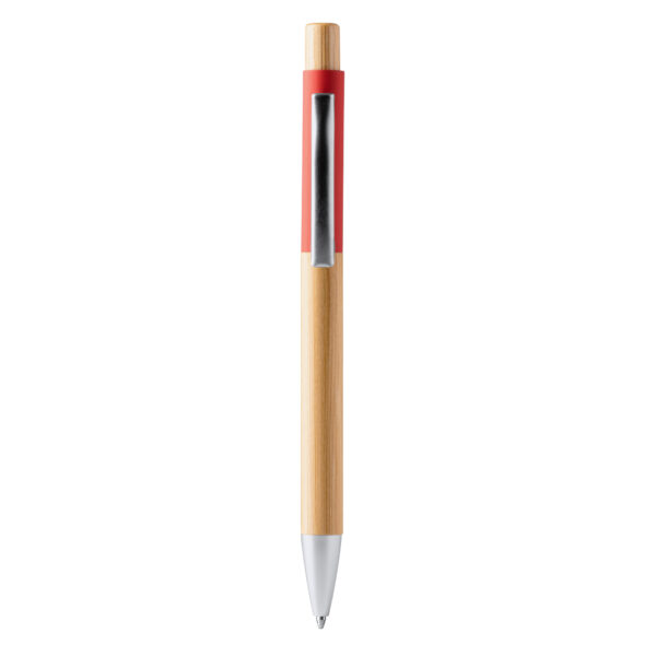 Bolígrafo con cuerpo y pulsador de bambú. Detalle en color de tacto suave. Punta y clip metálicos. Tinta azul. Composición: Bambú