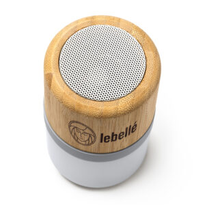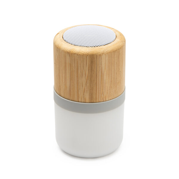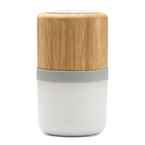 Altavoz inalámbrico con cuerpo elaborado en bambú y detalles en silicona.