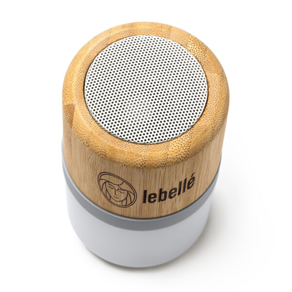 Potencia 3W y batería recargable. Cuenta con botón multifunción (ON/OFF) y luz led multicolor en la base con 4 modos de iluminación. Con salida de audio mediante Bluetooth.
