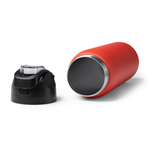 Bidón térmico con cuerpo elaborado en acero inoxidable 304 reciclado de doble pared para mantener las bebidas a una temperatura óptima. Tapa transparente y asa de transporte, extraíbles mediante un botón de apertura que la dota de mayor seguridad y comodidad. Con capacidad para 930 ml.