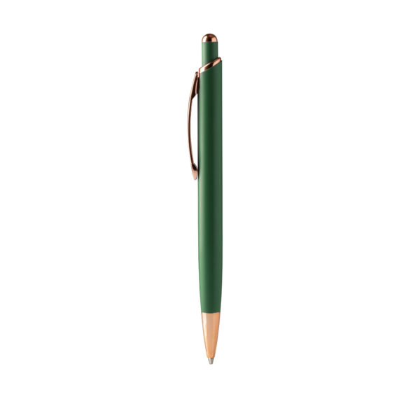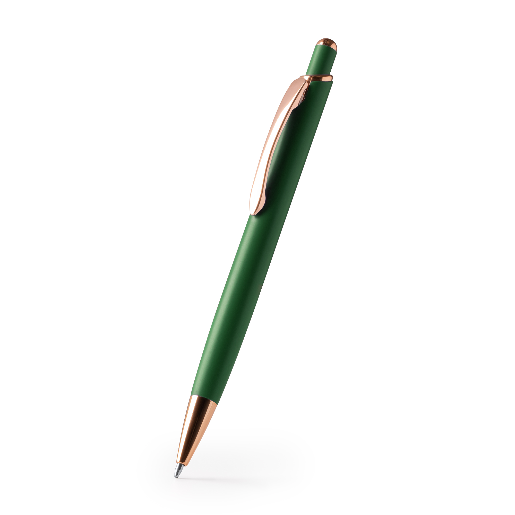 Bolígrafo pulsador con cuerpo metálico en mate con detalles en acabado cobre. Carga jumbo de tinta azul.Observaciones: Carga jumbo de tinta azul.