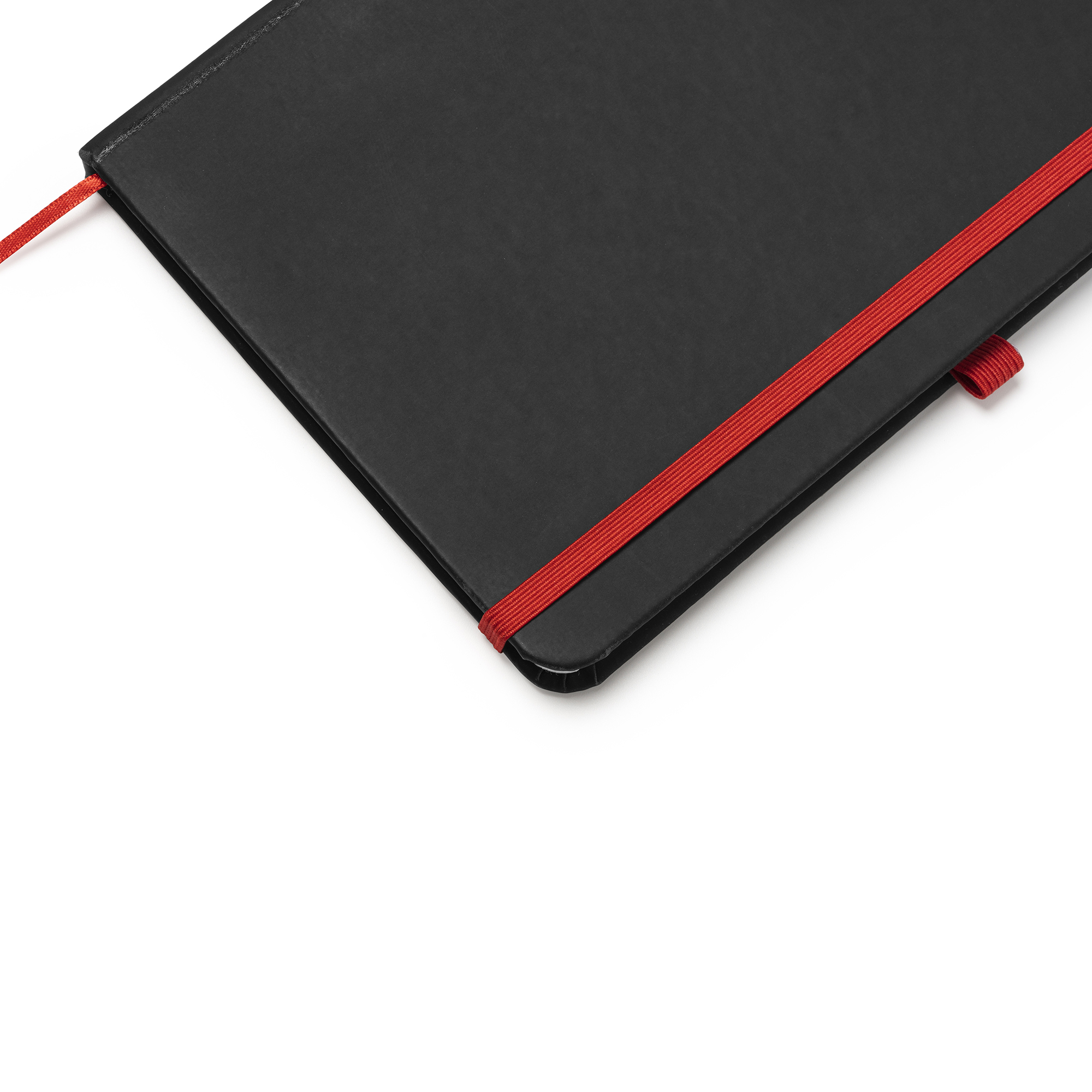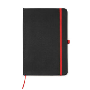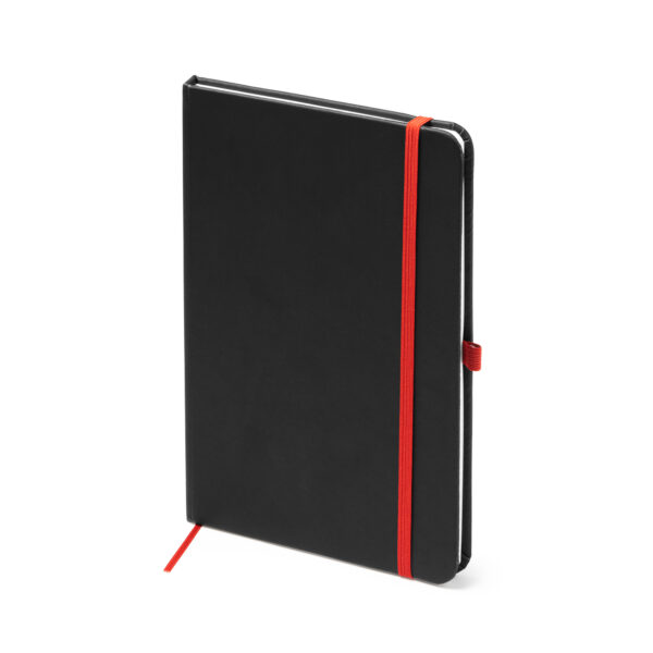 Bloc de notas A5 con tapa rígida de PU negro. Marcapáginas, banda elástica de cierre y soporte para bolígrafo a color. Cuenta con 80 hojas rayadas.