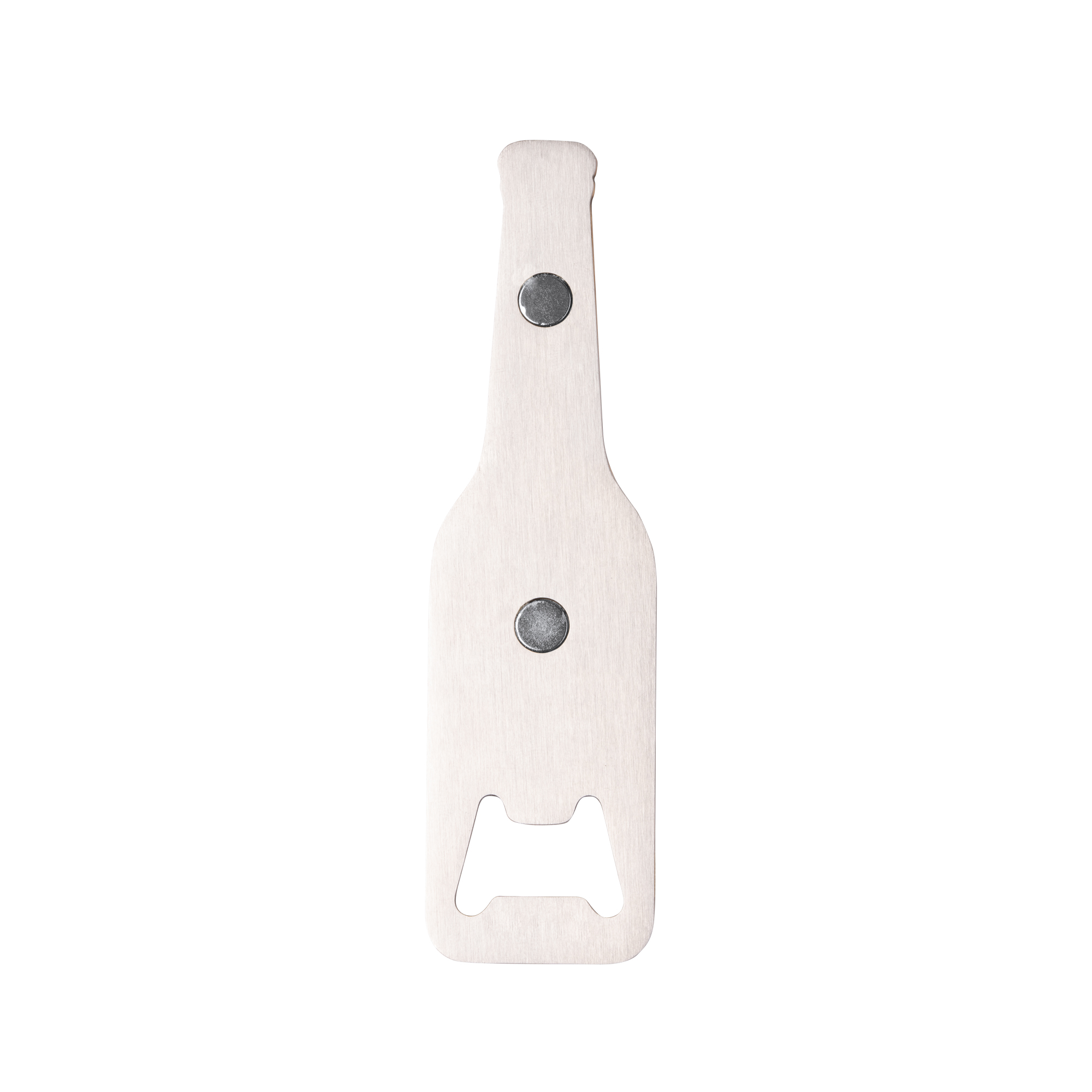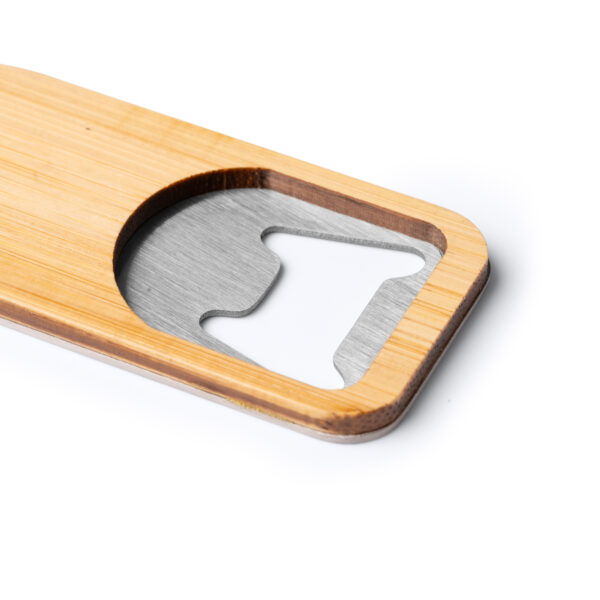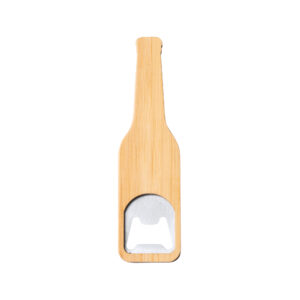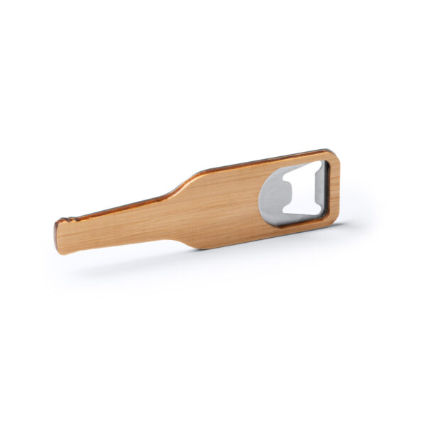 Abridor con forma de botella. Cuerpo de bambú y metal con imán.