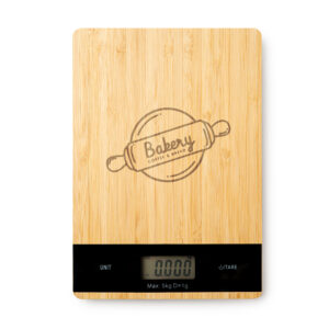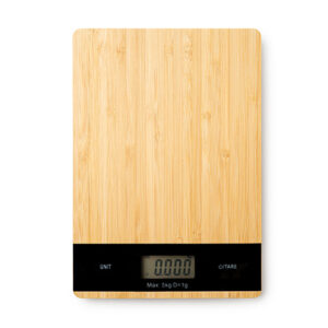 Báscula de cocina digital con carcasa frontal de bambú. Ideal para pesar los ingredientes y los alimentos cuando cocines tus mejores recetas. Con una capacidad máxima de 5 kg. Funciona con una pila incluida.