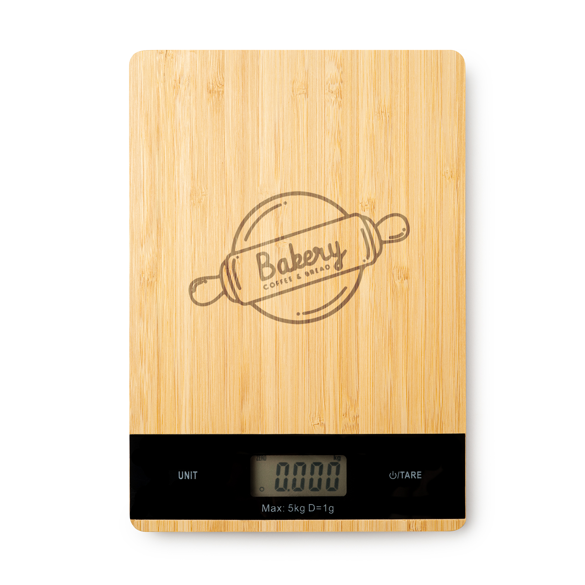 Báscula de cocina digital con carcasa frontal de bambú. Ideal para pesar los ingredientes y los alimentos cuando cocines tus mejores recetas. Con una capacidad máxima de 5 kg. Funciona con una pila incluida.